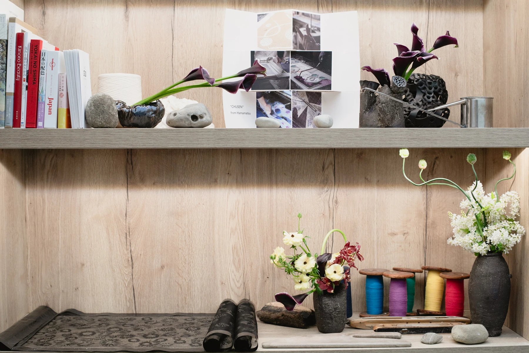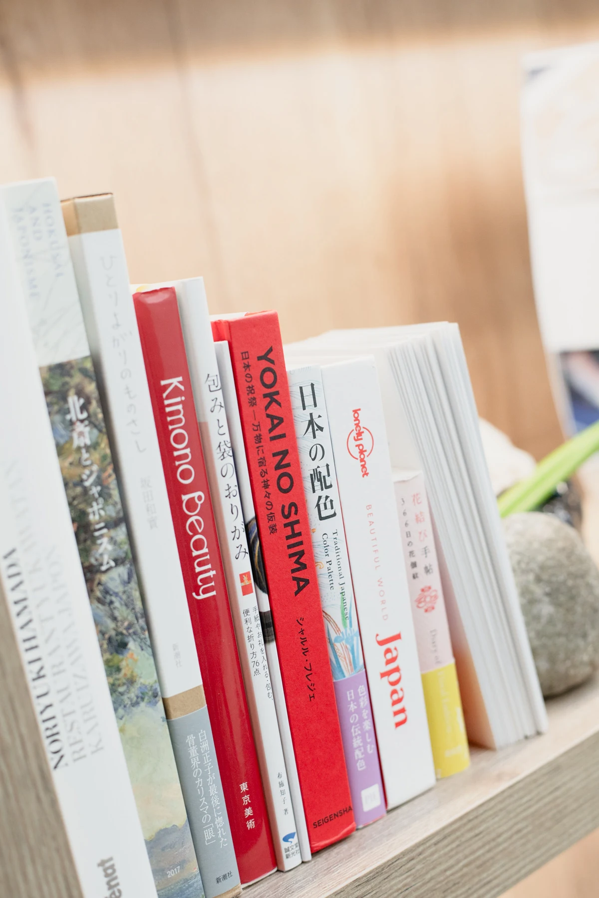 注染の型紙や日本の手仕事に欠かせない道具、糸や素材、日本文化にまつわる書籍などを展示しています。日本各地に受け継がれるクラフトマンシップの奥深さを視覚的・触覚的に感じられる空間です。