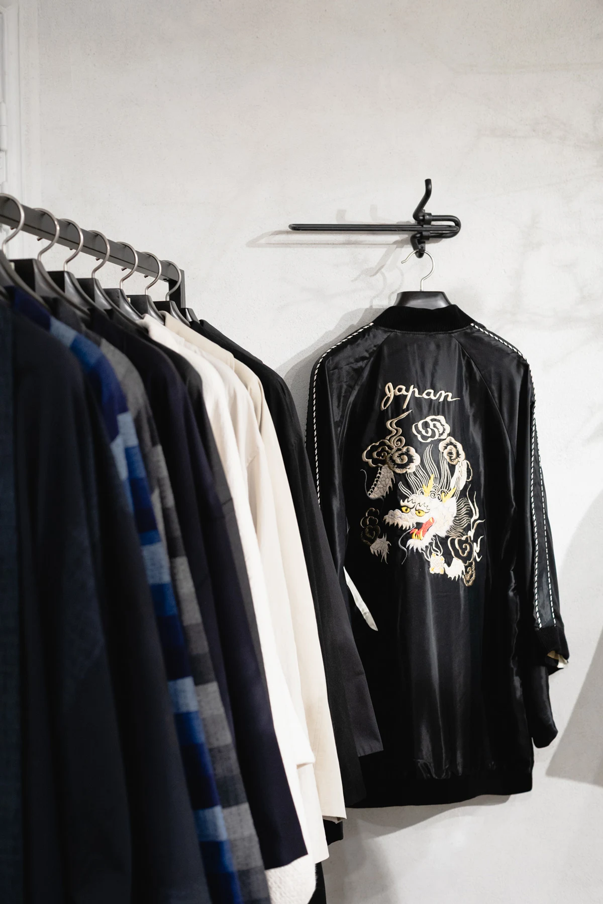 店奥には、選び抜かれたきもの生地や資料を収めた棚、オーク材と黒いスチールが印象的なフィッティングルームを設置。山形県産のストーングレーカーペット、佐賀県産の和紙で仕立てた天井パネルなど、日本の素材と技術が空間の随所に息づいています。