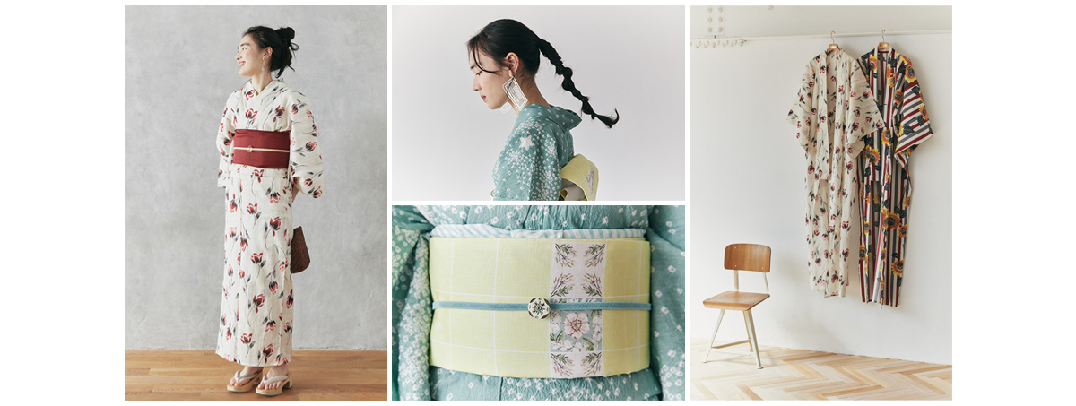 今期のピックアップは絞りのゆかた。一つ一つ職人の手作業によって作られた絞りの浴衣は、特有の凹凸感により肌に密着せず夏場でもさらっと着られ、ふんわりとした女性らしいラインを作り上げてくれます。定番の夏らしいカラーはもちろん、長く愛せる一着としてお召しいただけるようにイエロー×グレーの配色や、ゆかたでは珍しいブラウンなどKIMONO by NADESHIKOオリジナル配色も登場。
