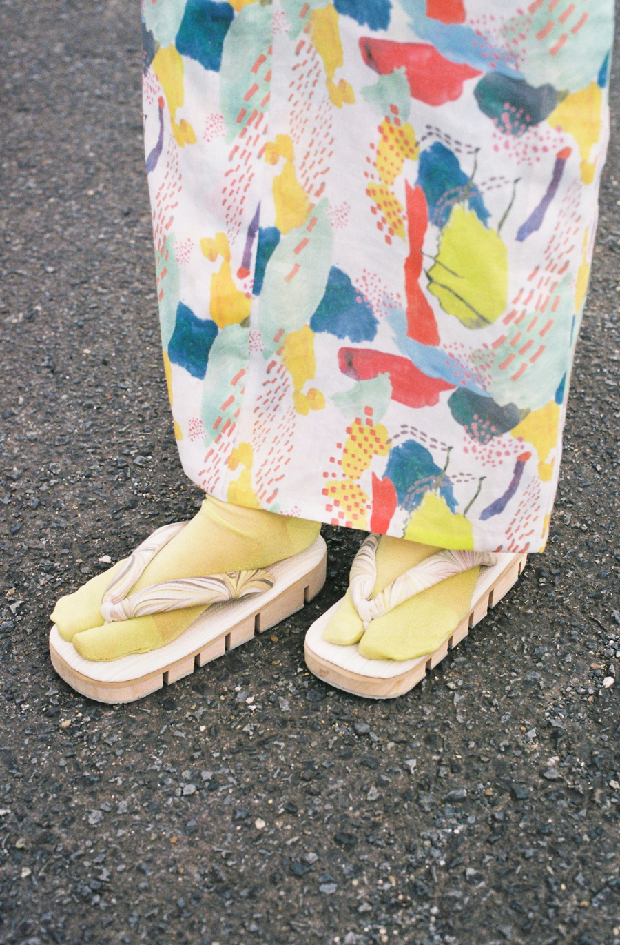 鼻緒部分には墨流しの片貝木綿の生地を使用し、一足一足異なる表情が魅力で、足元を見るだけで心踊るようなデザインを目指しました。台には、ソファーなどに用いられるPVC加工を施した合皮を採用し、丈夫で汚れにくい仕様です。また表面の凹凸感により、ベタつきによる夏の蒸れを軽減します。