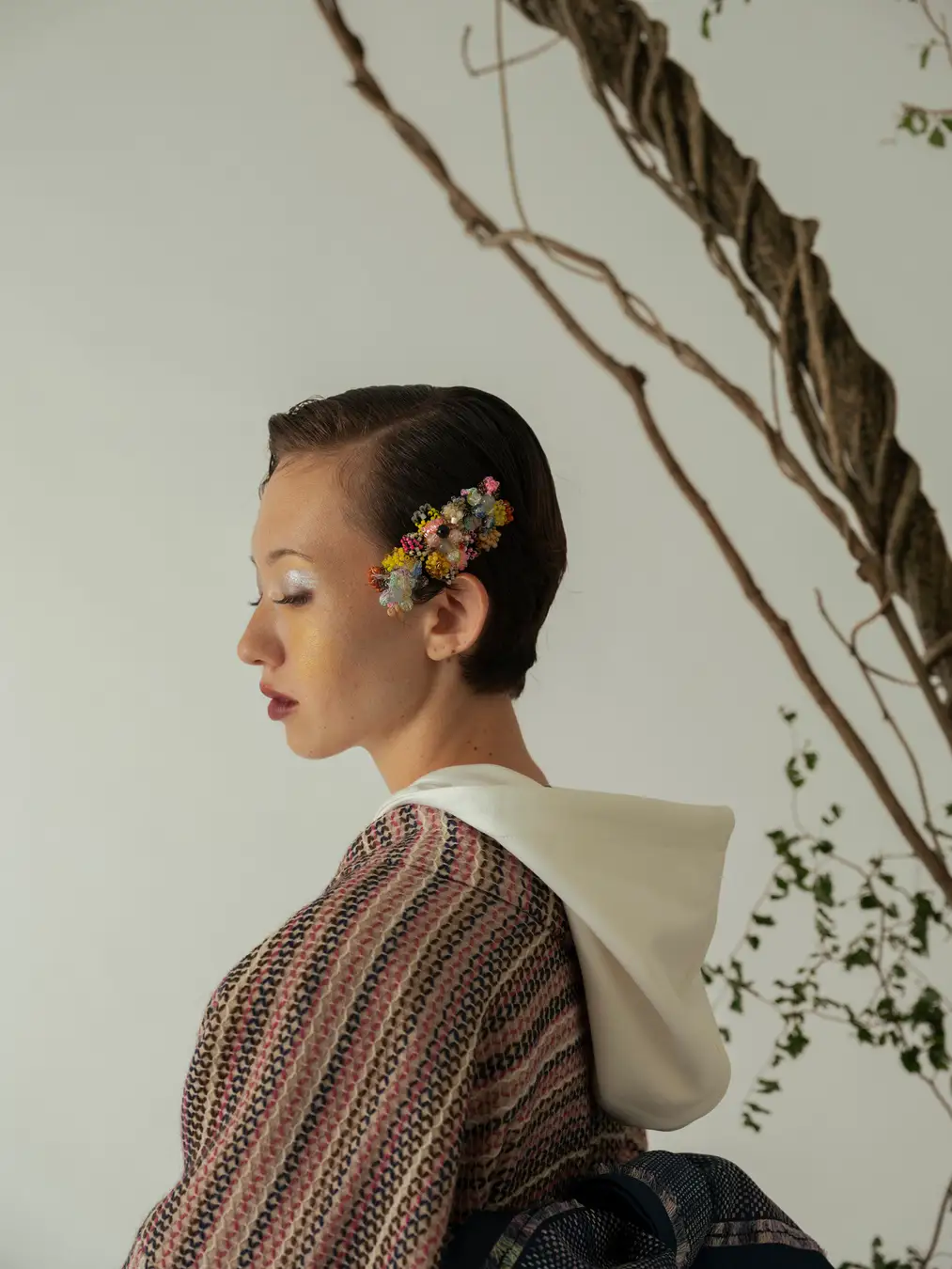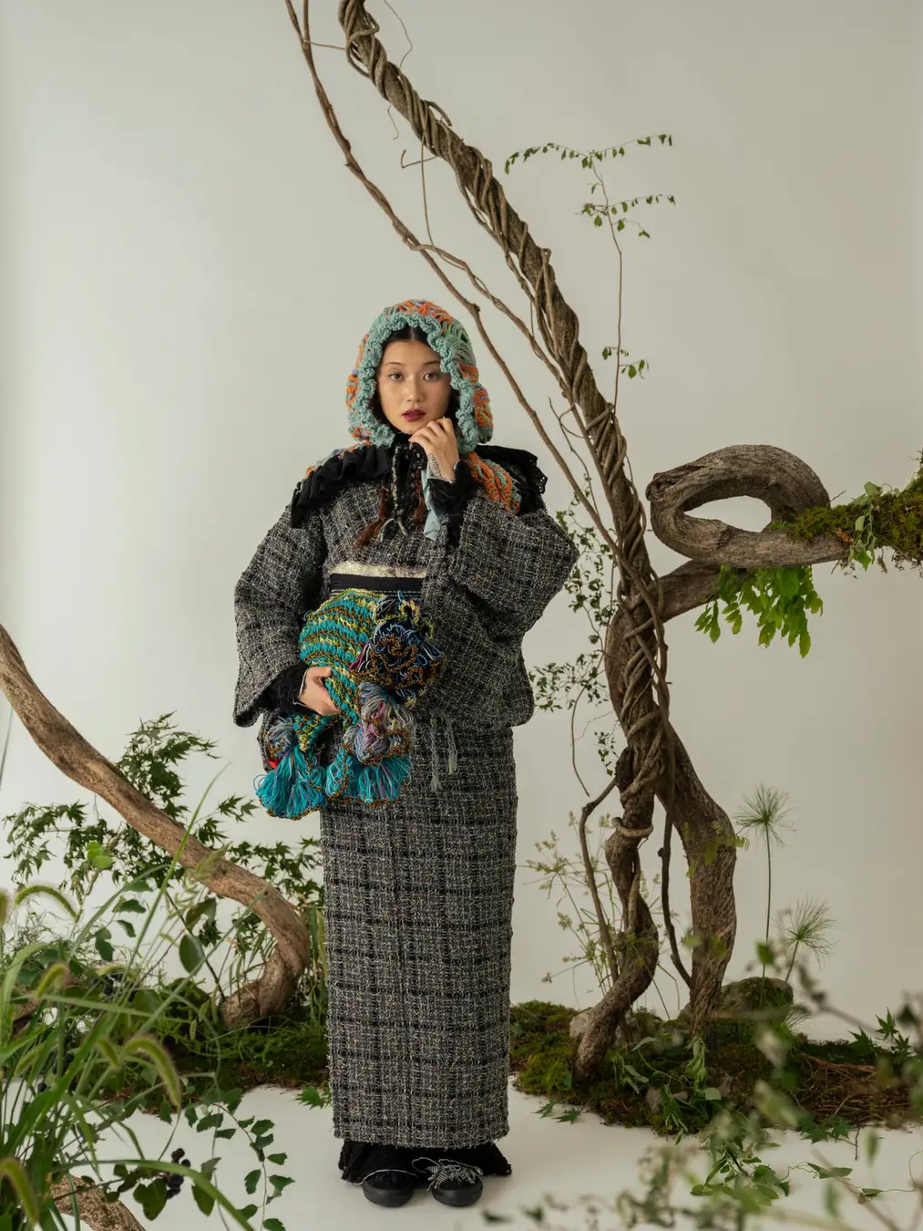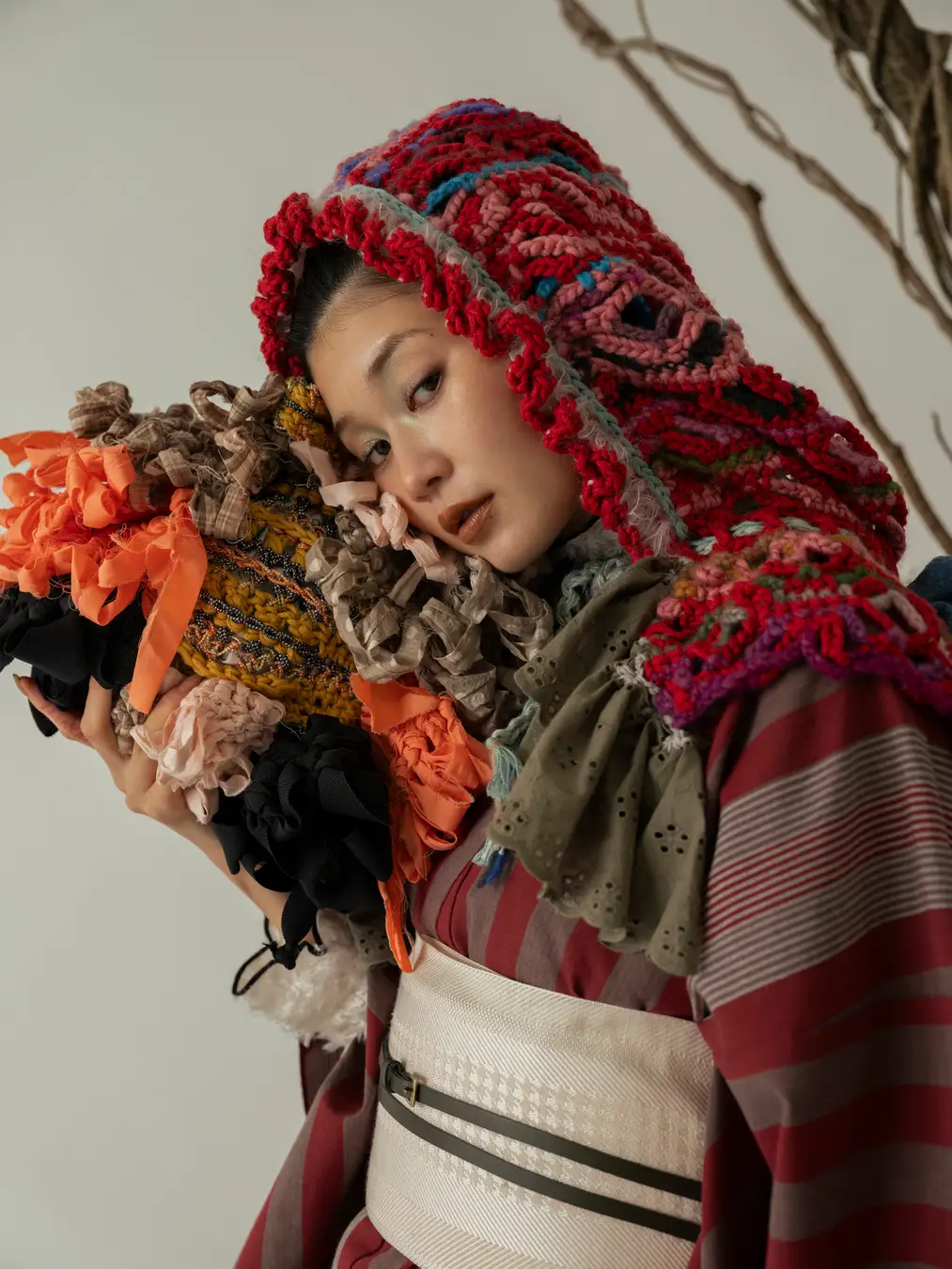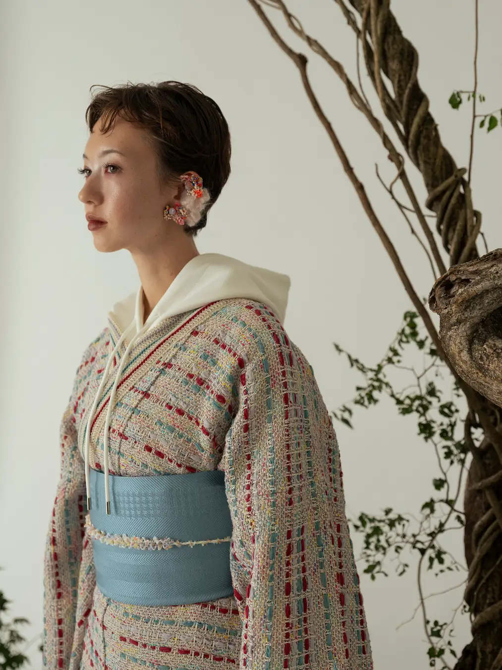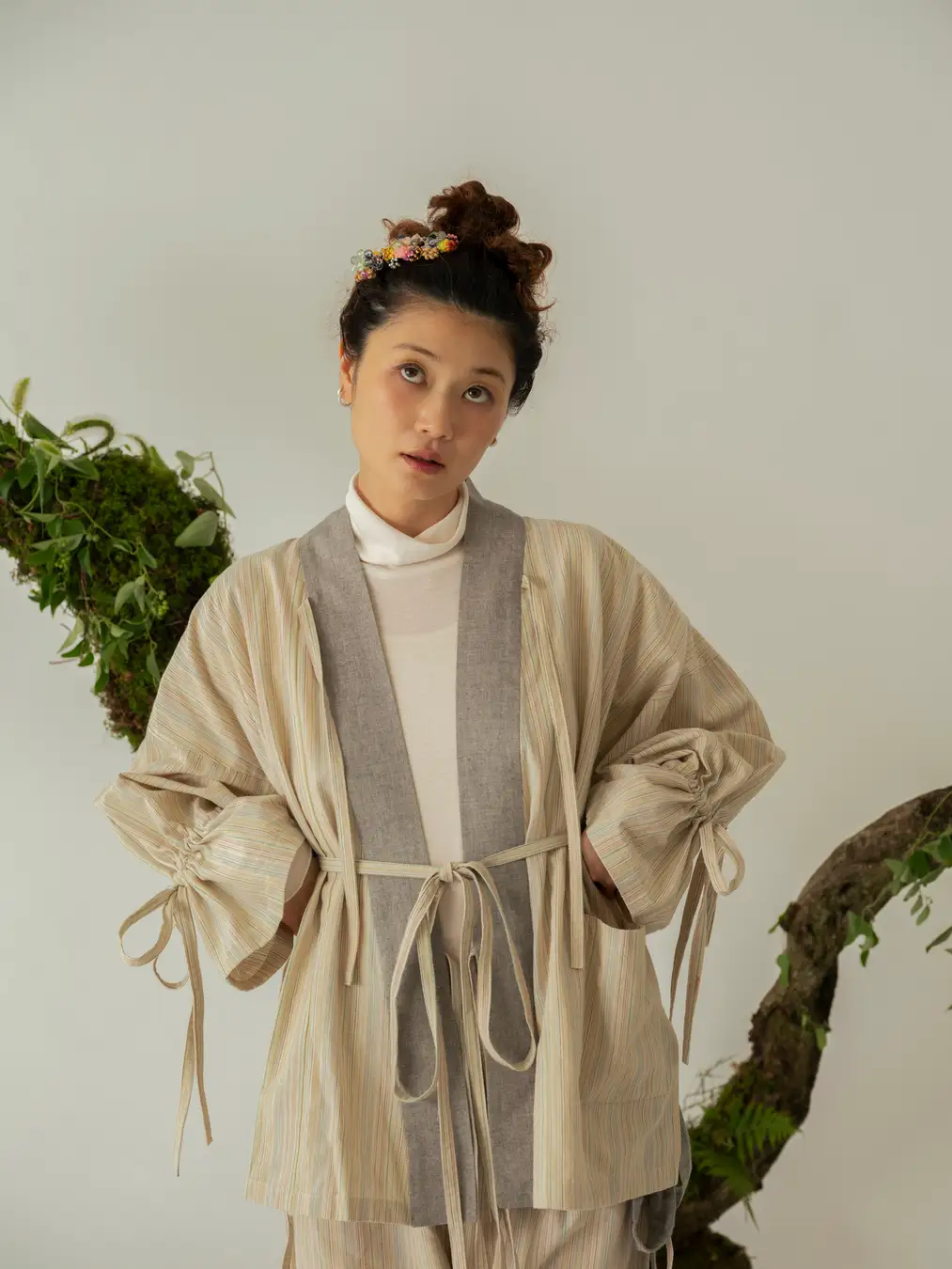 直線からなる「きもの」に独自のエッセンスを加えた"KIMONO ARCH"の生地を、まるで生きているかのような唯一無二のフォルムに"an/eddy"が編み上げます。