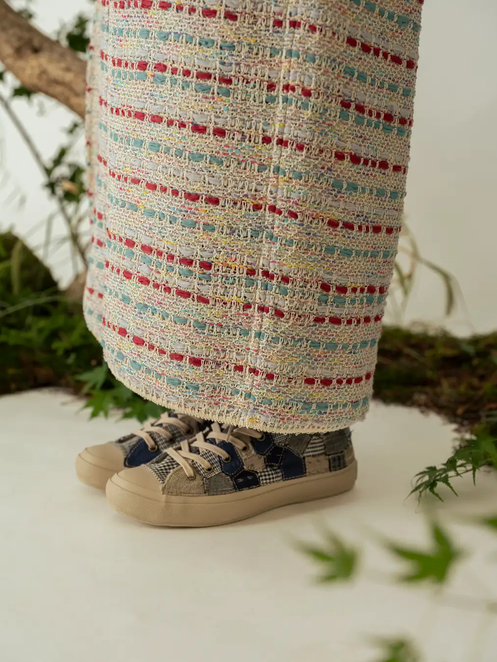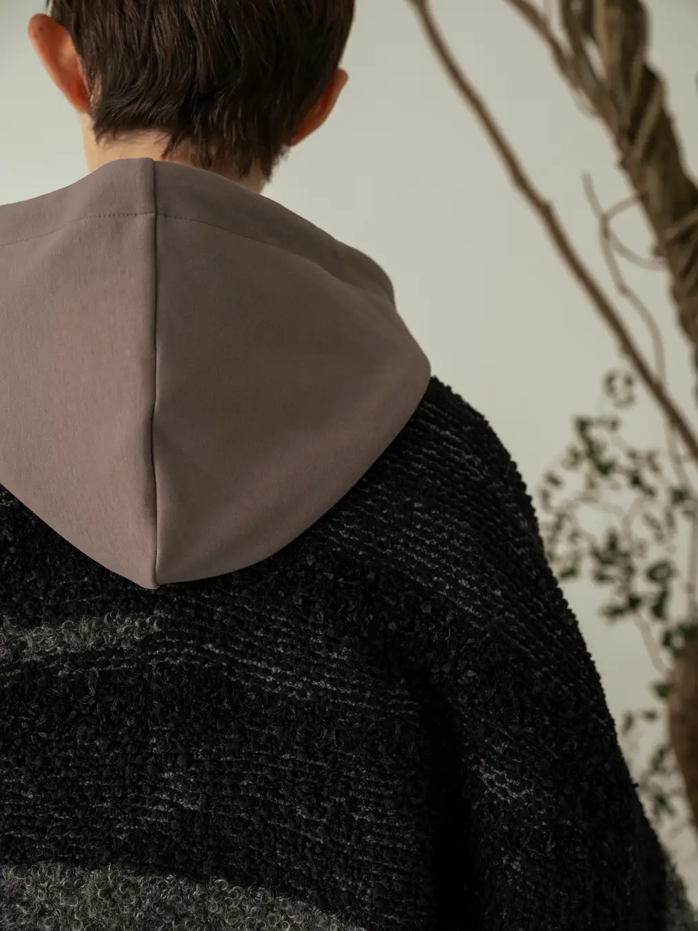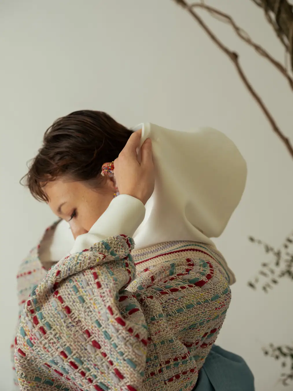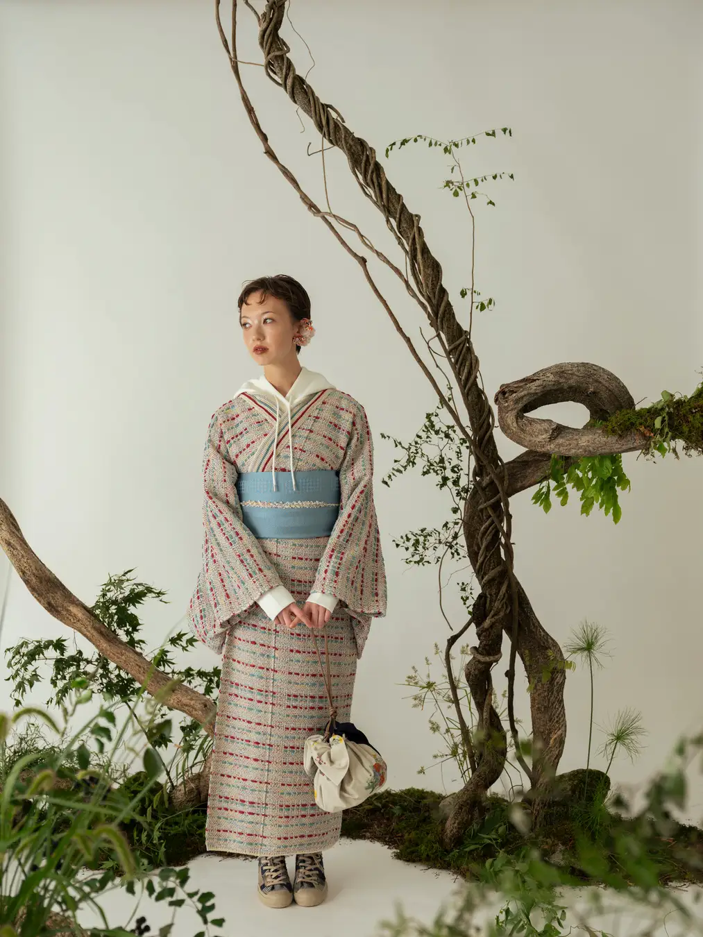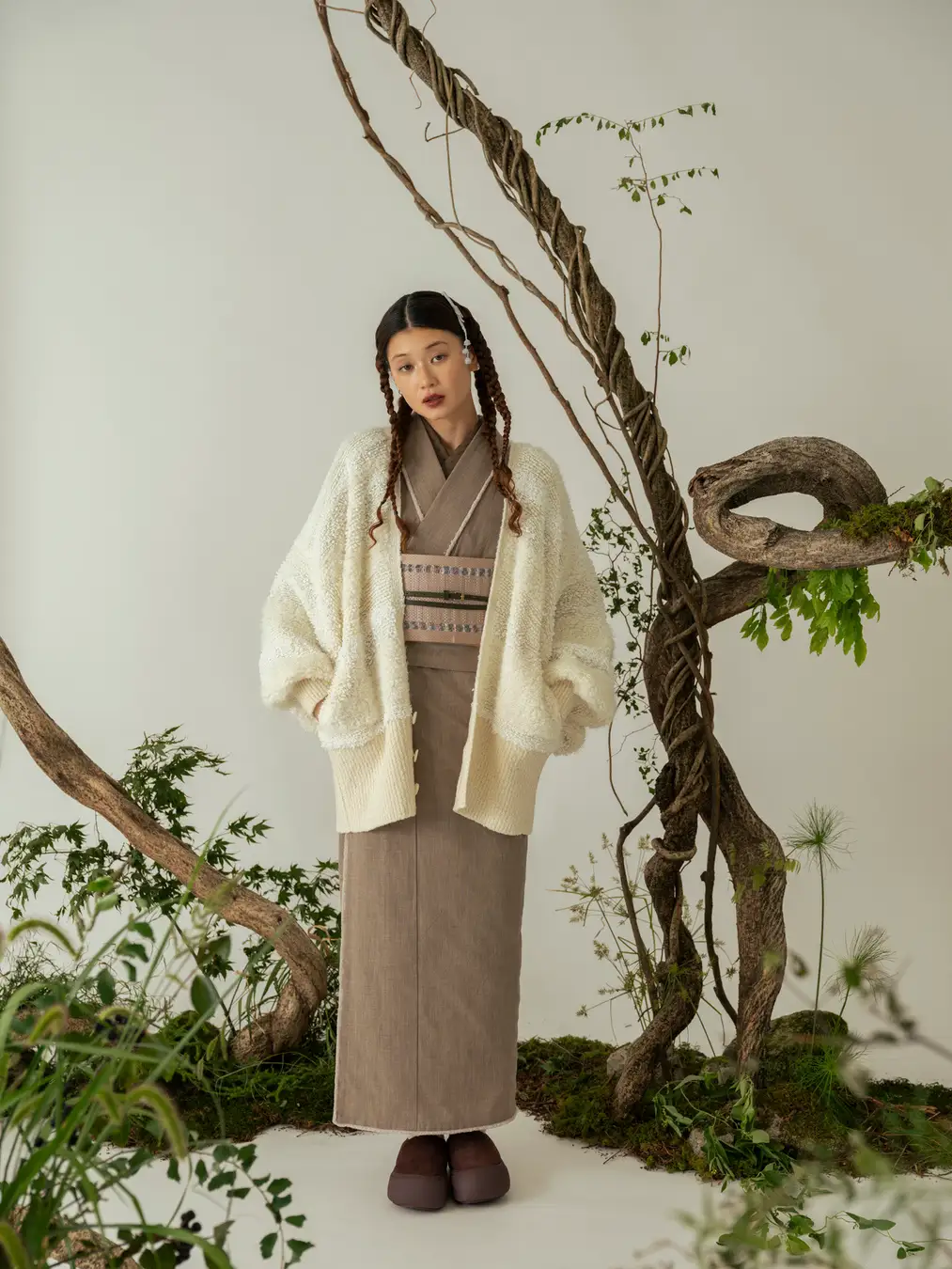 ニットツイード・インレイ編みを採用し、編み物でありながら型崩れしにくい独特の生地感に仕上げました。ニット特有の伸縮性とゆかたの丈感を両立させるため、試行錯誤を重ねて完成した一着です。