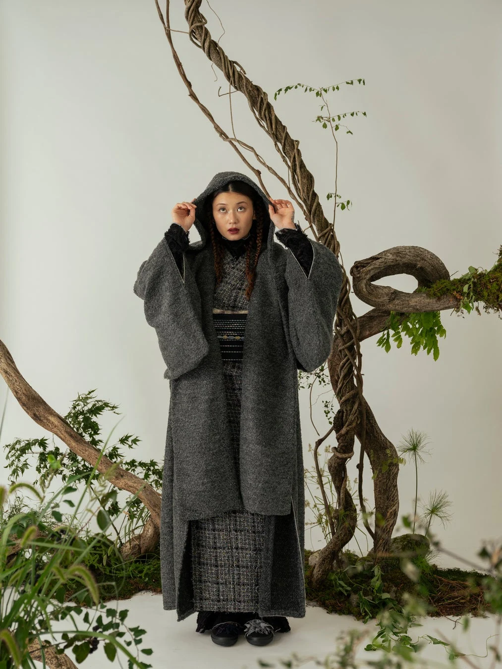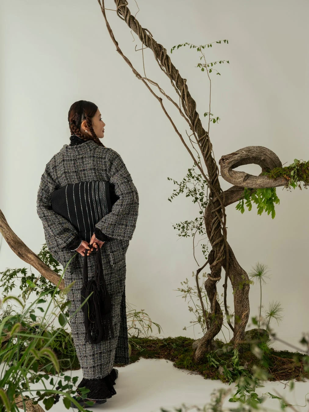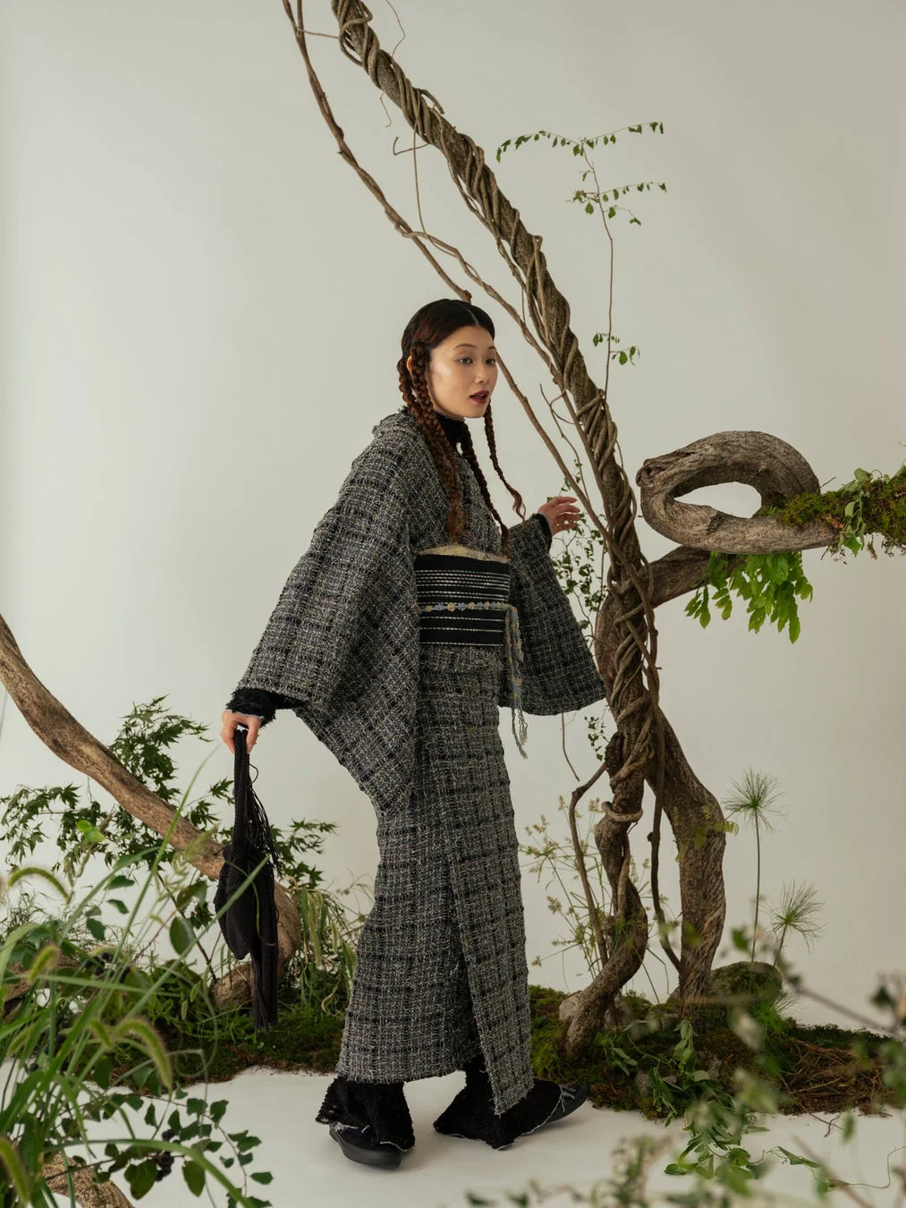 今コレクションでは、フォーマルシーンのスーツやジャケットにも使われるツイードやウール生地を中心に、糸の魅力と手しごとの温もりを掛け合わせたきものを展開します。