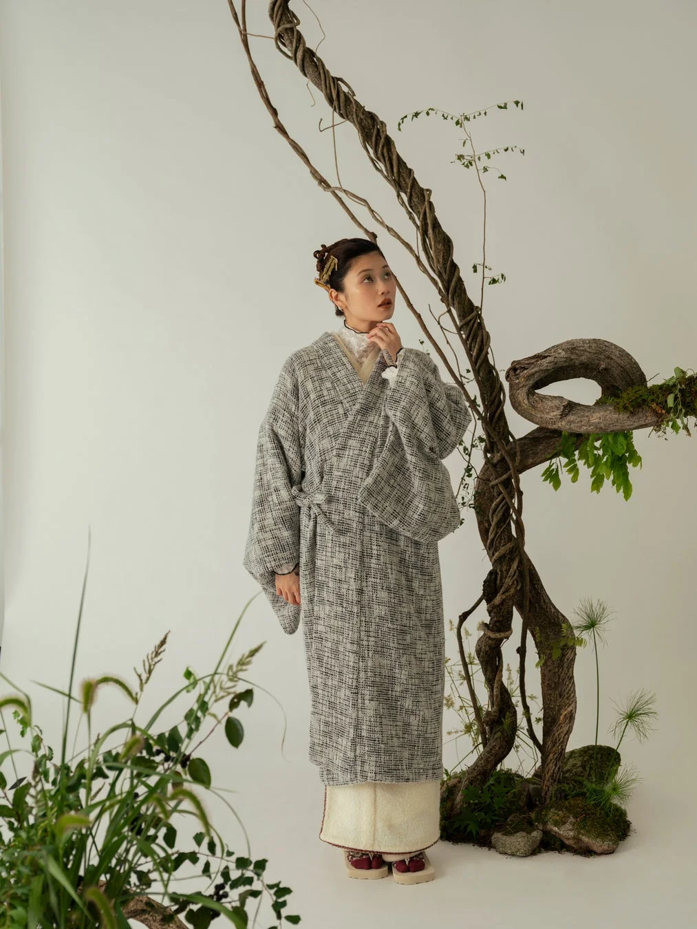 現在では、手しごとの風合いを大切にしたツイードの一種として発展し、日本でも岩手や山形など、羊の飼育が盛んな土地に根づいた産業として受け継がれています。ARCHが大切にする“その土地ならではの手しごと”の魅力に光を当て、世界を見渡す視点を一枚のきものに宿しています。