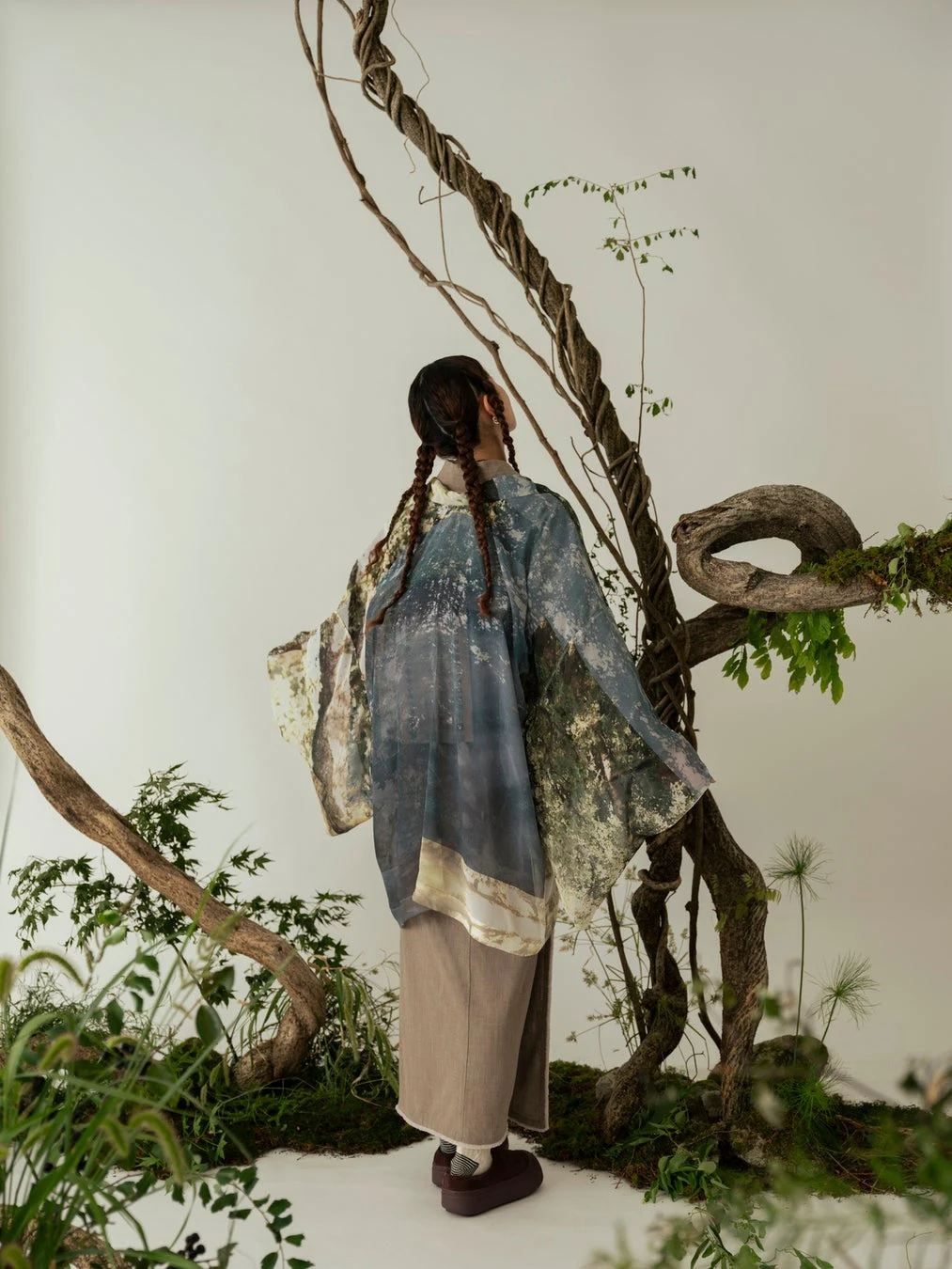 ずっしりとした木の安心感、水の恵みや風の音、木漏れ日の柔らかさ——今シーズンのテーマを象徴する羽織。ARCHのフォトグラファーである小財美香子氏が、日常で何気なく撮りためてきた写真の中から、近くに有る穏やかさを思い返させてくれる写真を選びました。まるでその風景の中にいるような、風をまとう感覚を与えてくれる透け感のある素材を合わせています。着ているときの心地よさはもちろん、街中でもいつでも穏やかな空気をまとわせてくれる、趣のある一枚です。