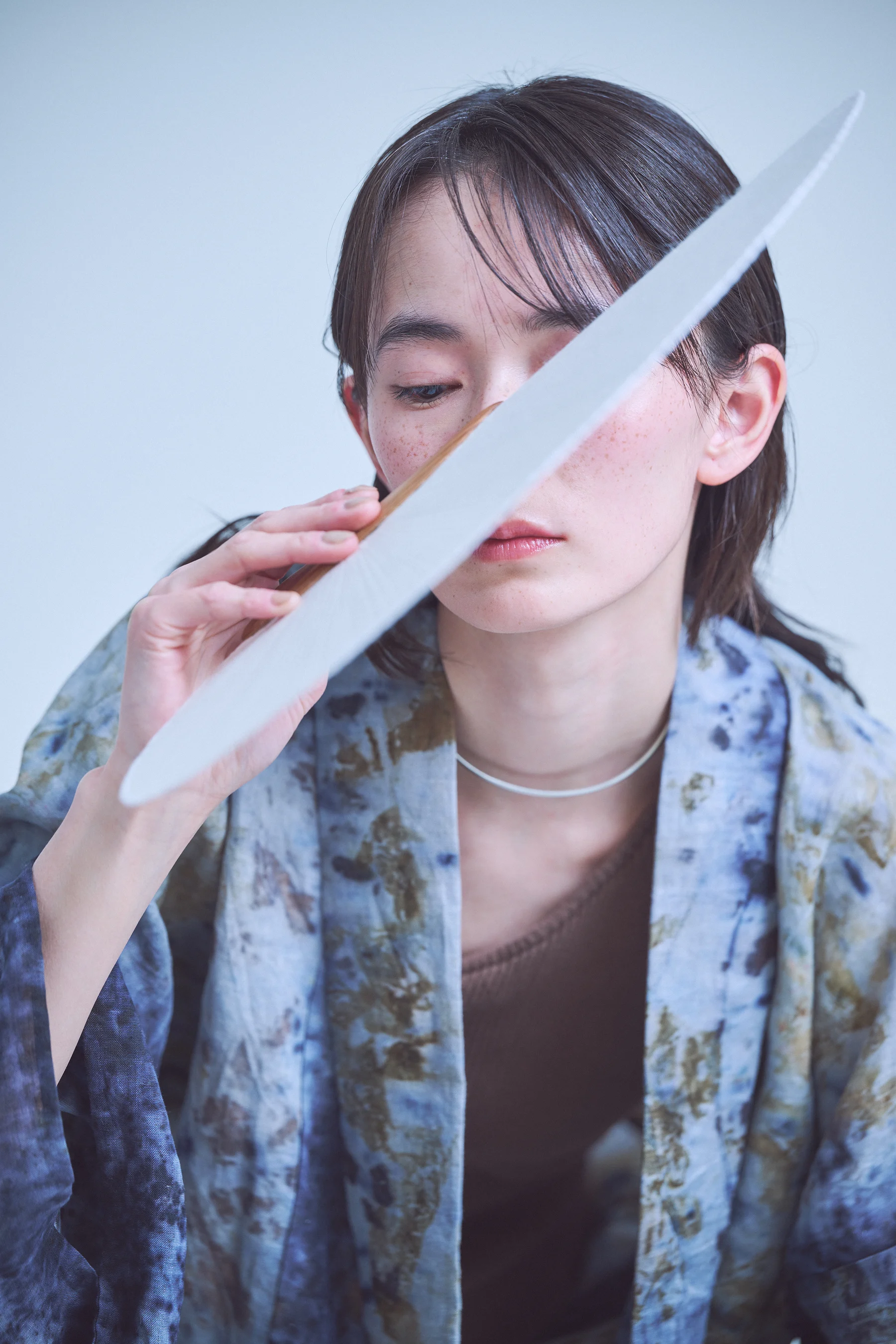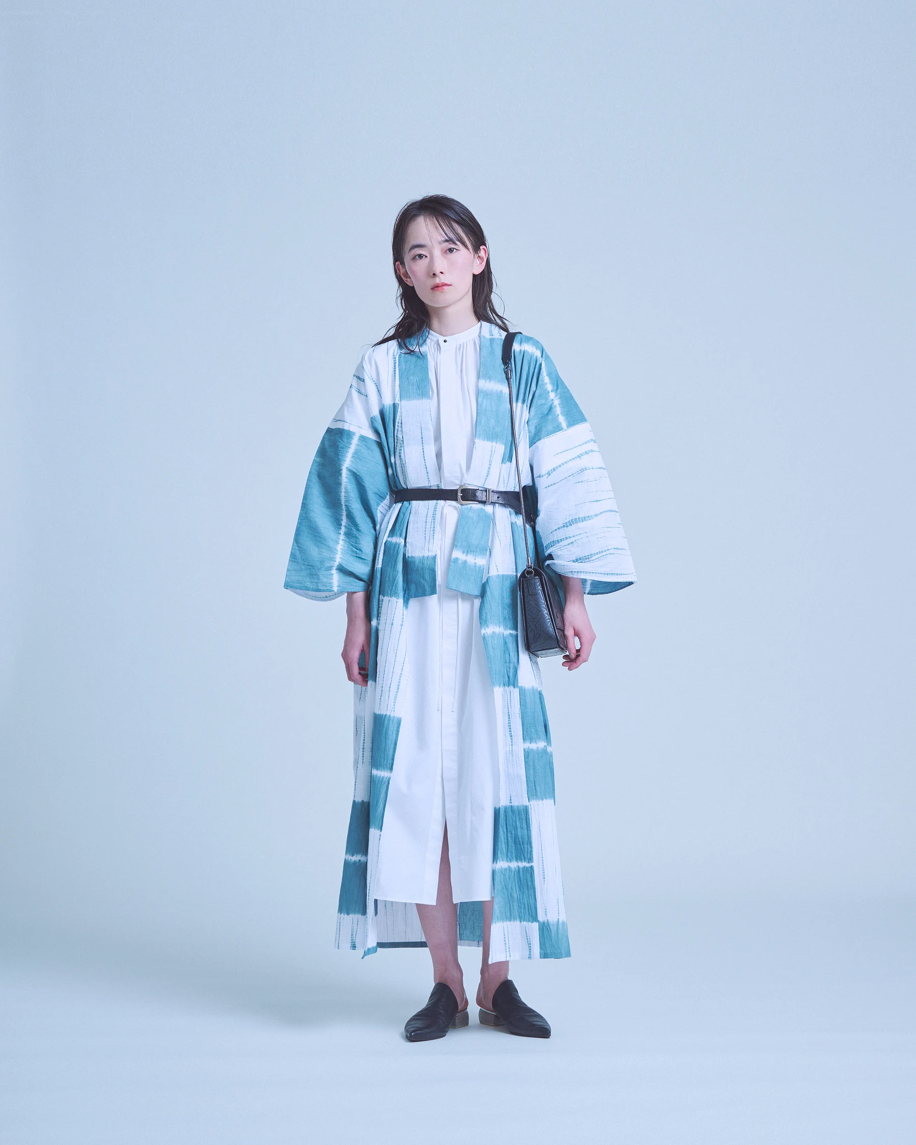今コレクションでは、絞り染め特有の「ゆらぎ」を際立たせる直線的な柄が印象的です。手しごとならではの特性により、同じ柄でも一枚ごとに異なる表情が生まれます。