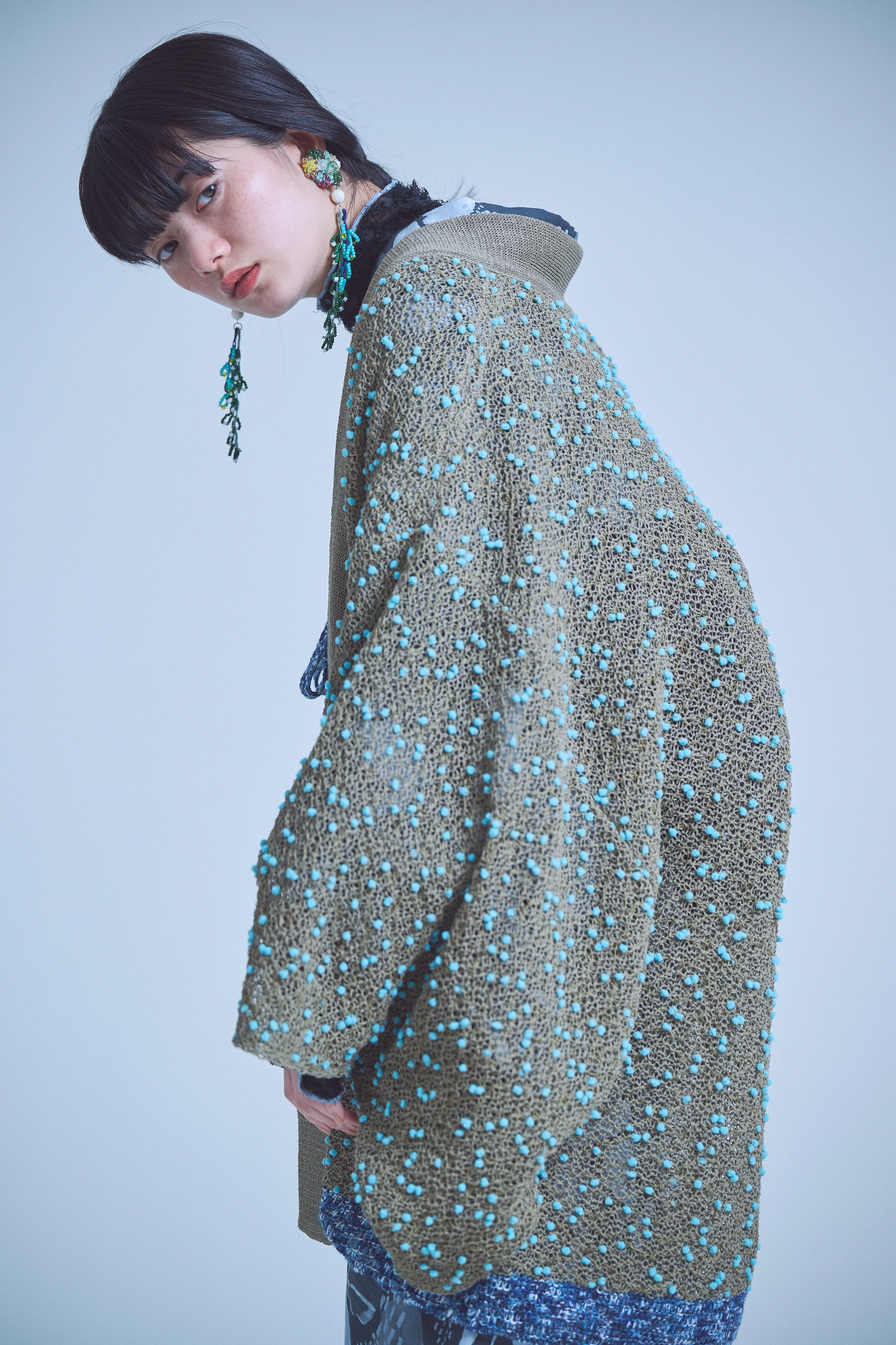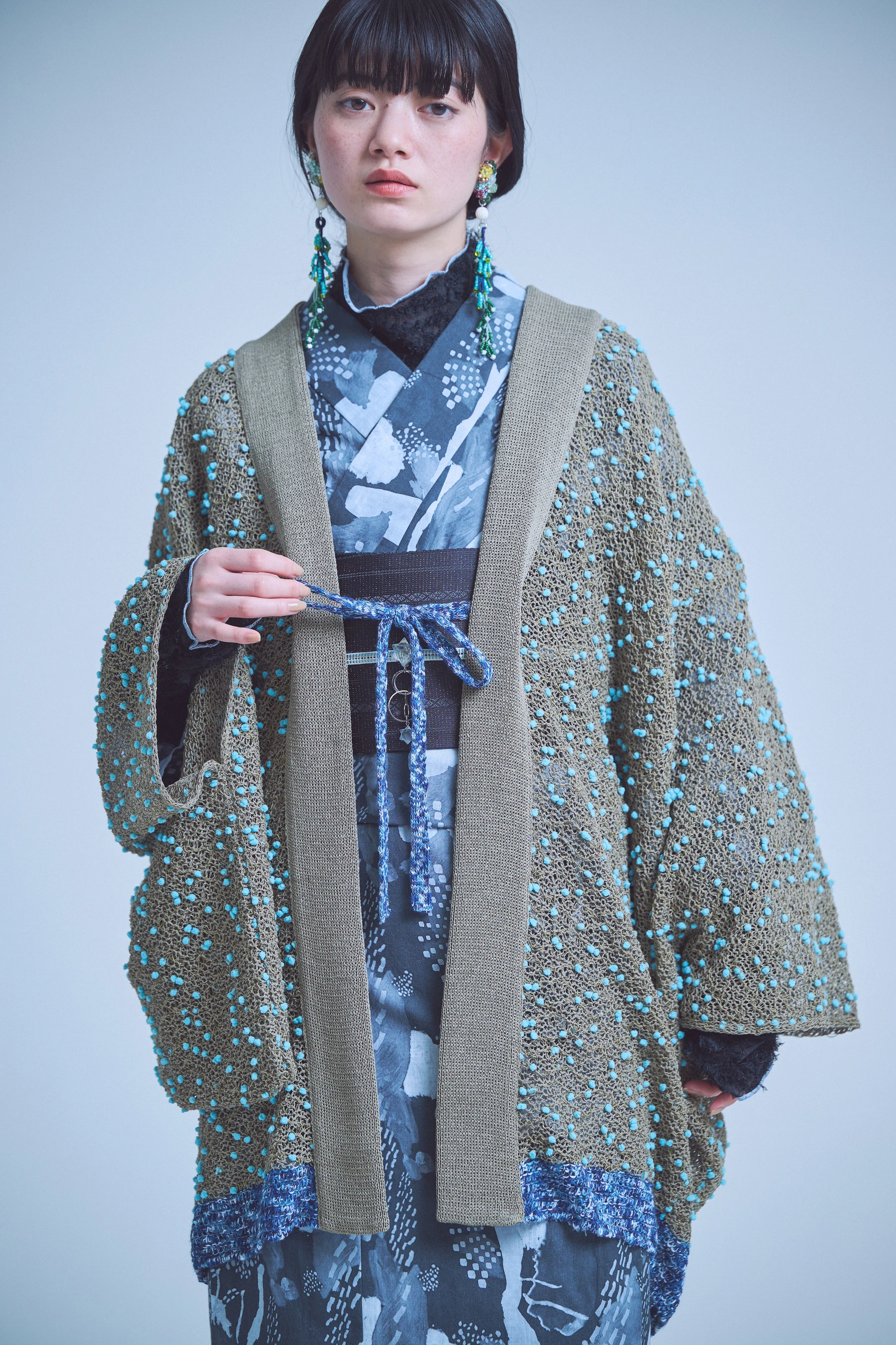山形で製作したニットの羽織。編み目を大きくとった透け感のある軽やかな編地に、装飾のある毛糸が浮かび上がる不思議な表情が魅力です。