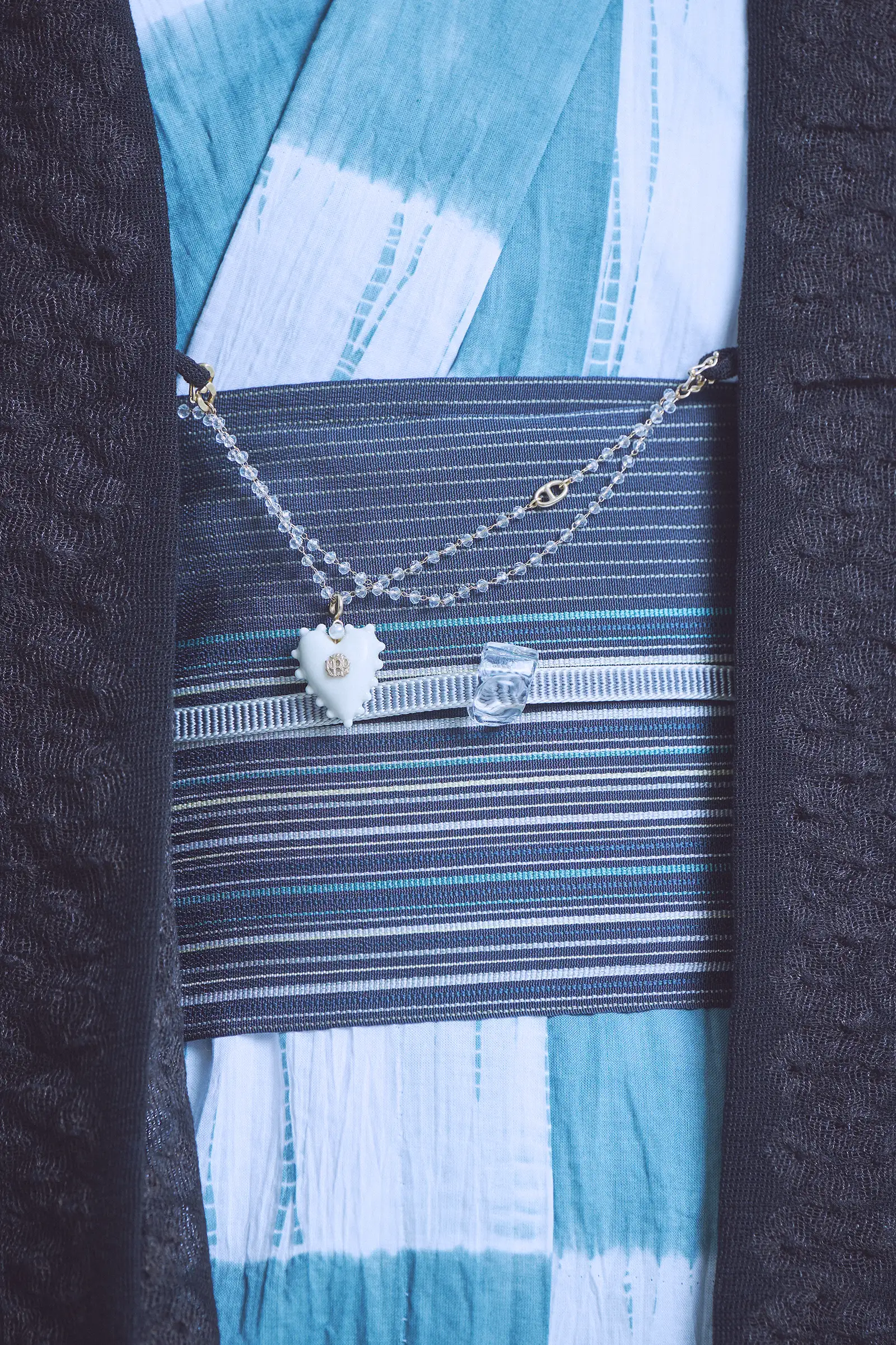 水の流れや光の揺らぎを思わせるフォルムは、自然の生命力や儚さを映し出すような佇まい。無色透明のガラスは光を受けて表情を変え、きものスタイリングに繊細な存在感を添えます。