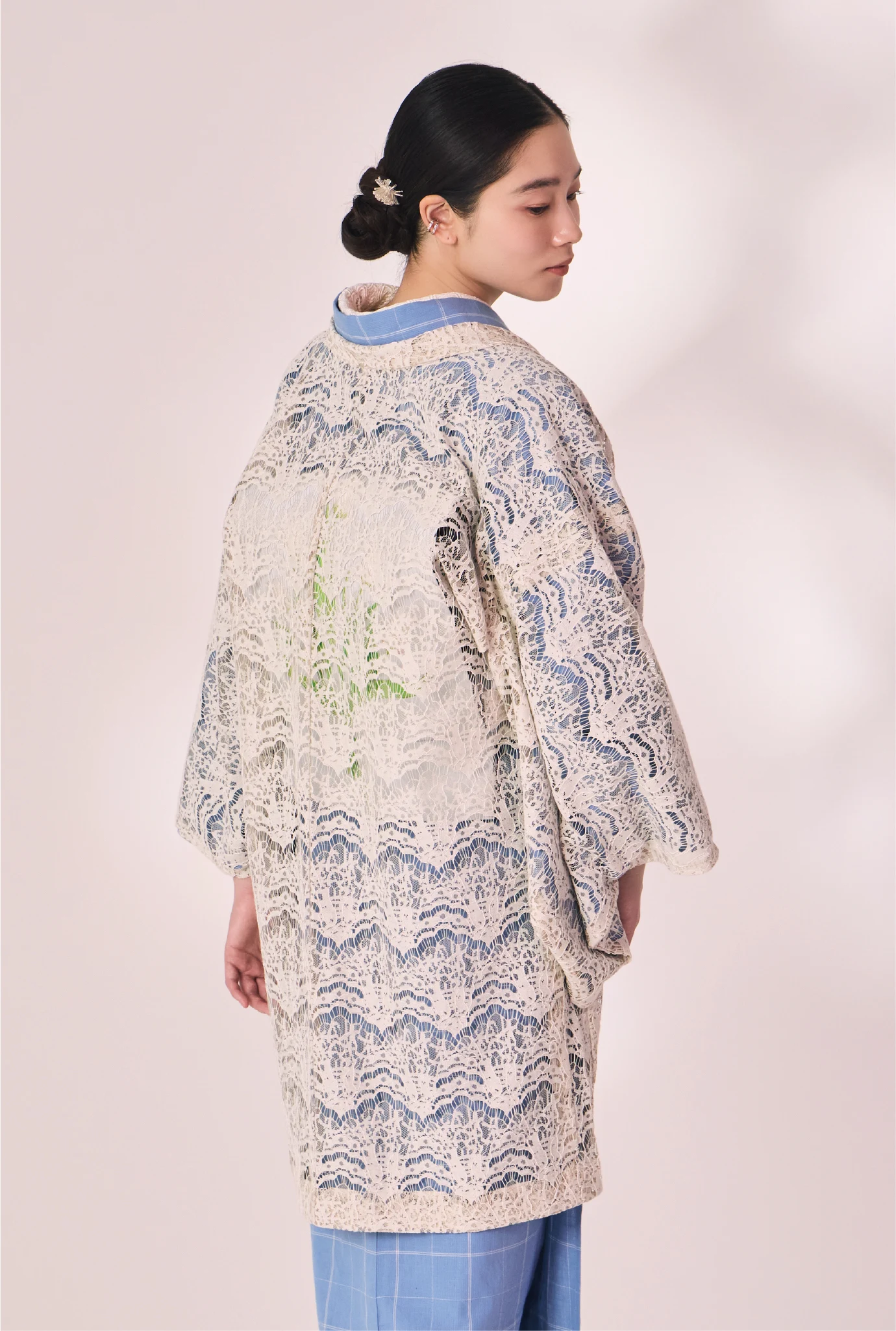繊細なコードレースを使用し、スカラップ状に波打つレース柄がポイントの羽織。
