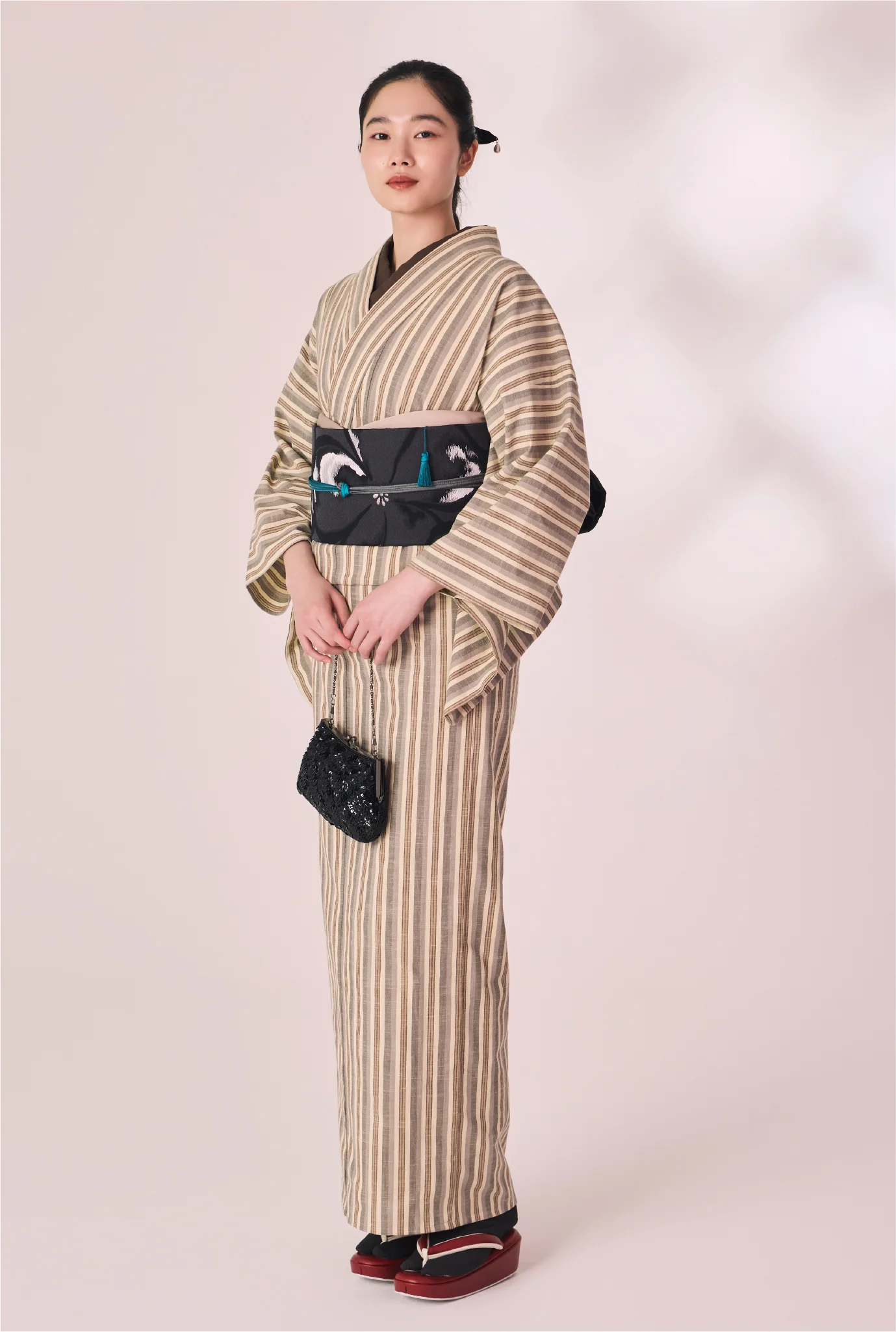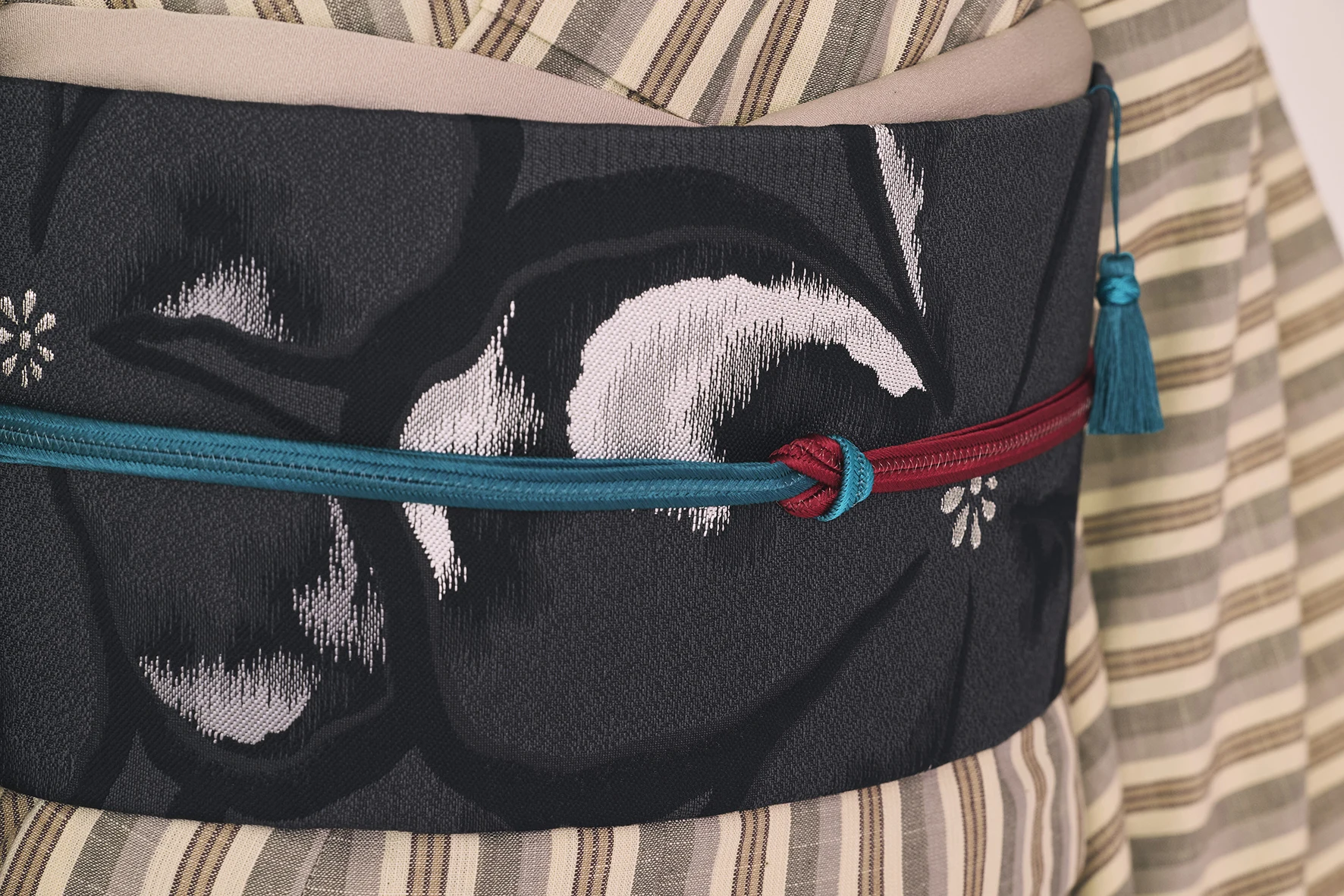 粋な縞柄は黒い帯を合わせてレトロシックなスタイルに。
