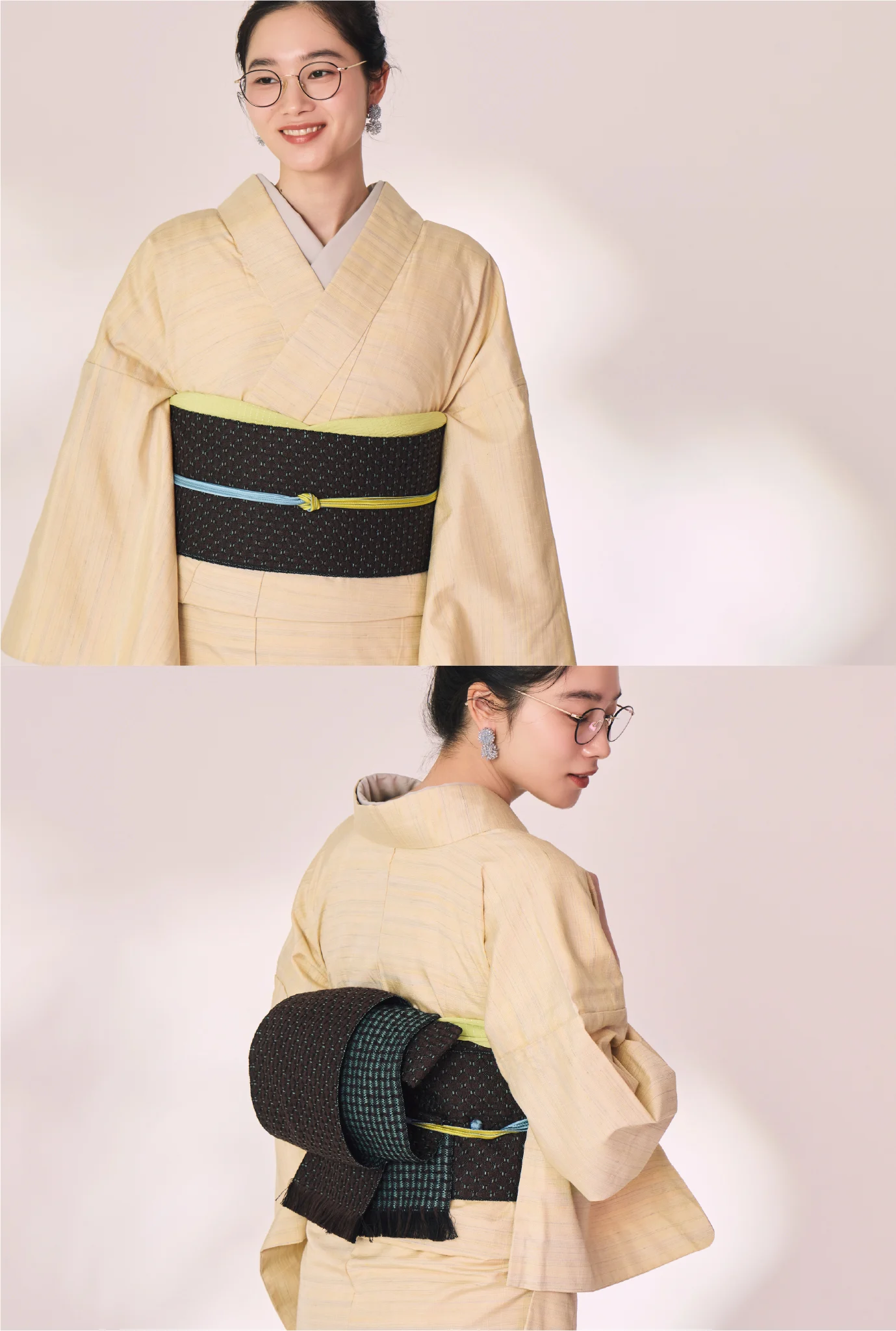 米沢のリバーシブル半幅帯を合わせ、山形のさんち(産地)を纏うコーディネートに。