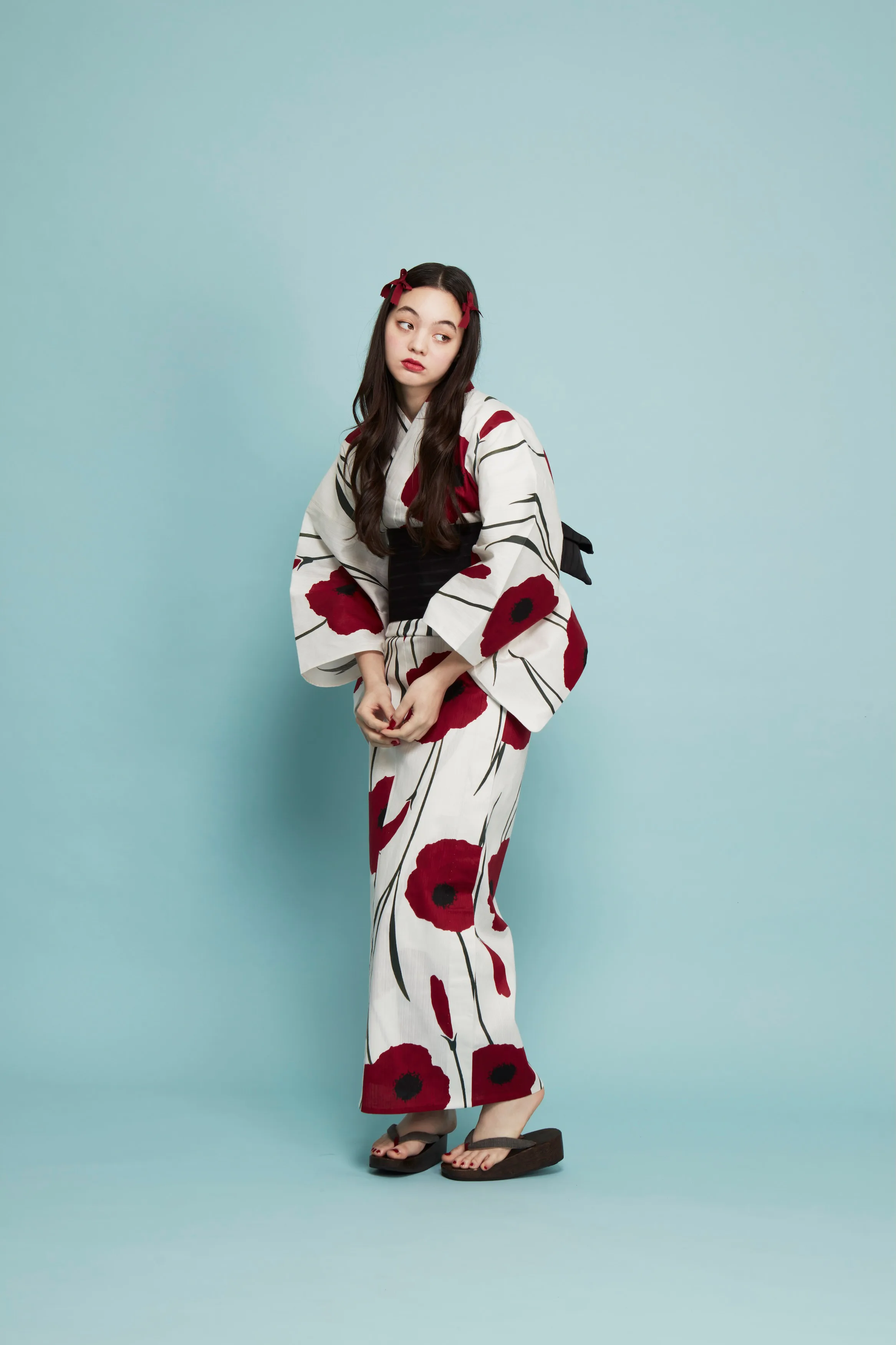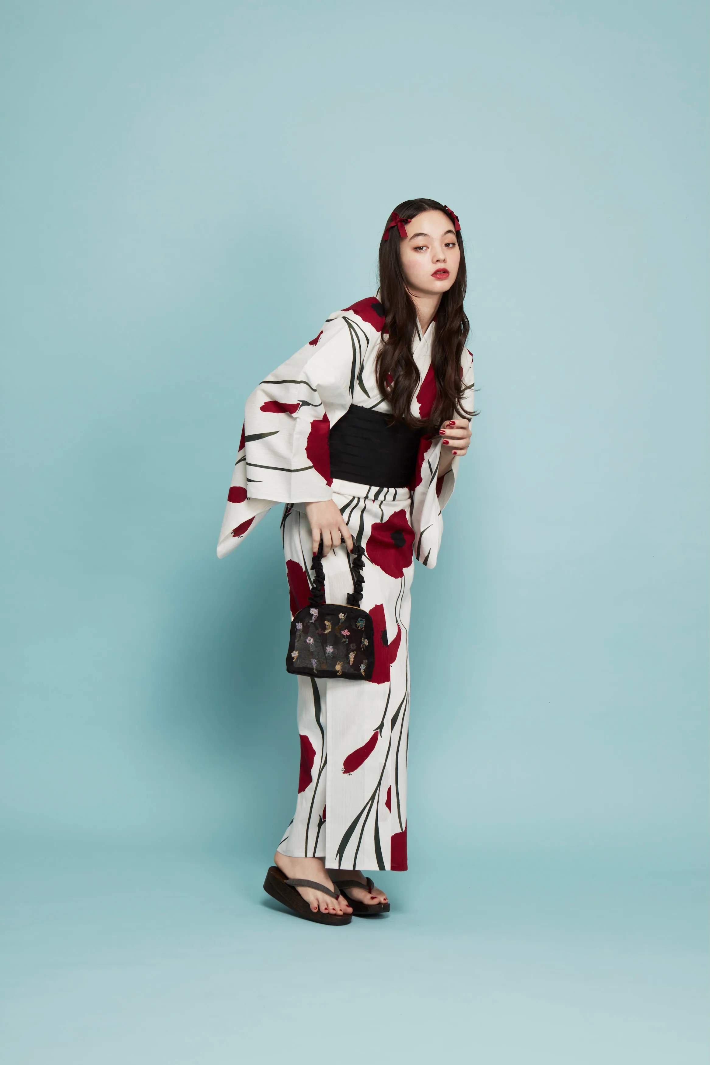 中原淳一が「スケッチ帖」に描いた少女のイラストをもとに、大胆な柄付けと印象的な赤の色彩にこだわり再現した一枚。花びらの濃淡に加え、葉や茎にも色を重ねることで奥行きのある表現に仕上げました。流れを感じる柄行きが、着姿を美しく彩ります。