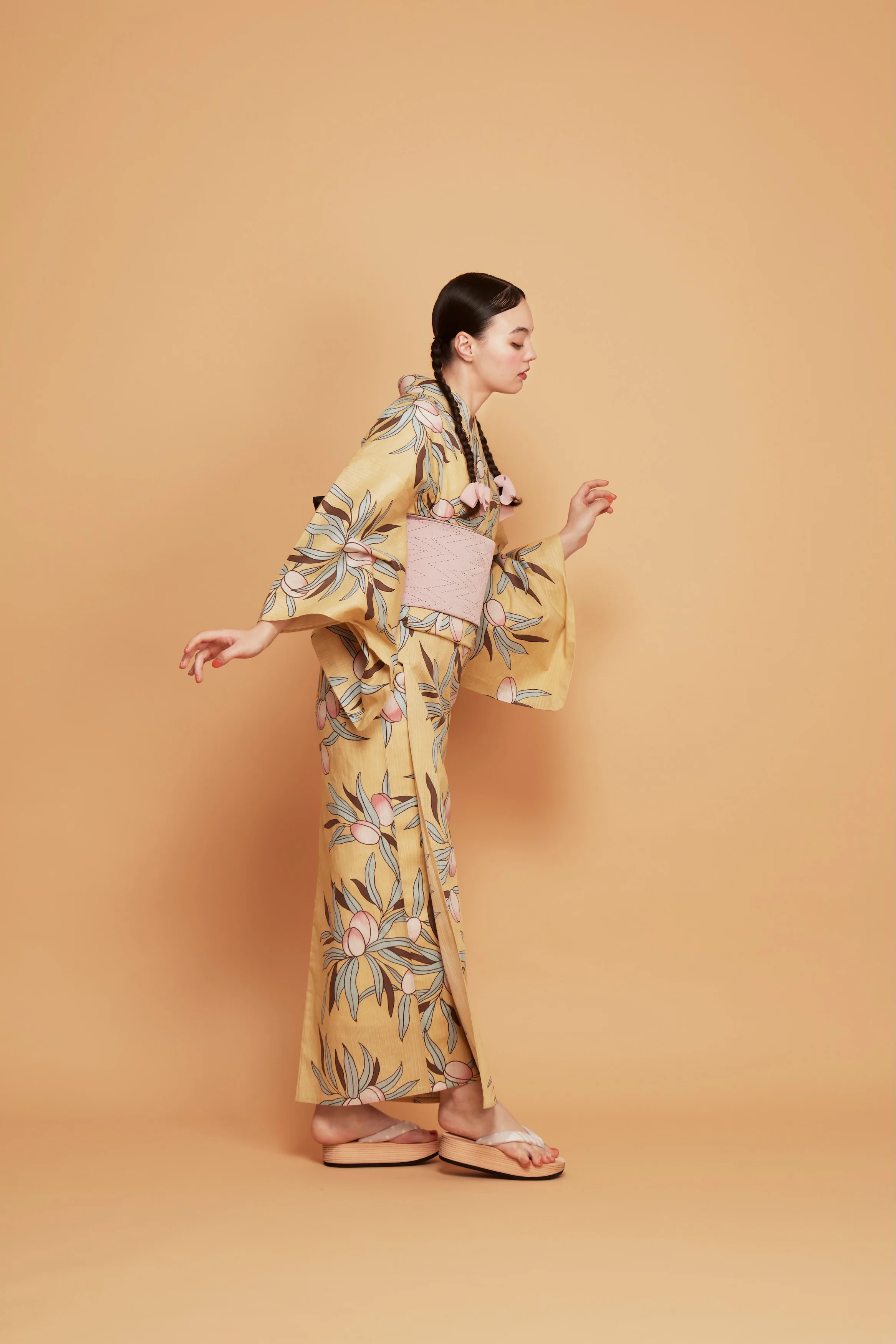 中原淳一がデザインした便箋に描かれたイラスト「ひとり」の少女の装いをもとに再現。桃を思わせる果実のモチーフが、夏の装いにやわらかな彩りを添えます。