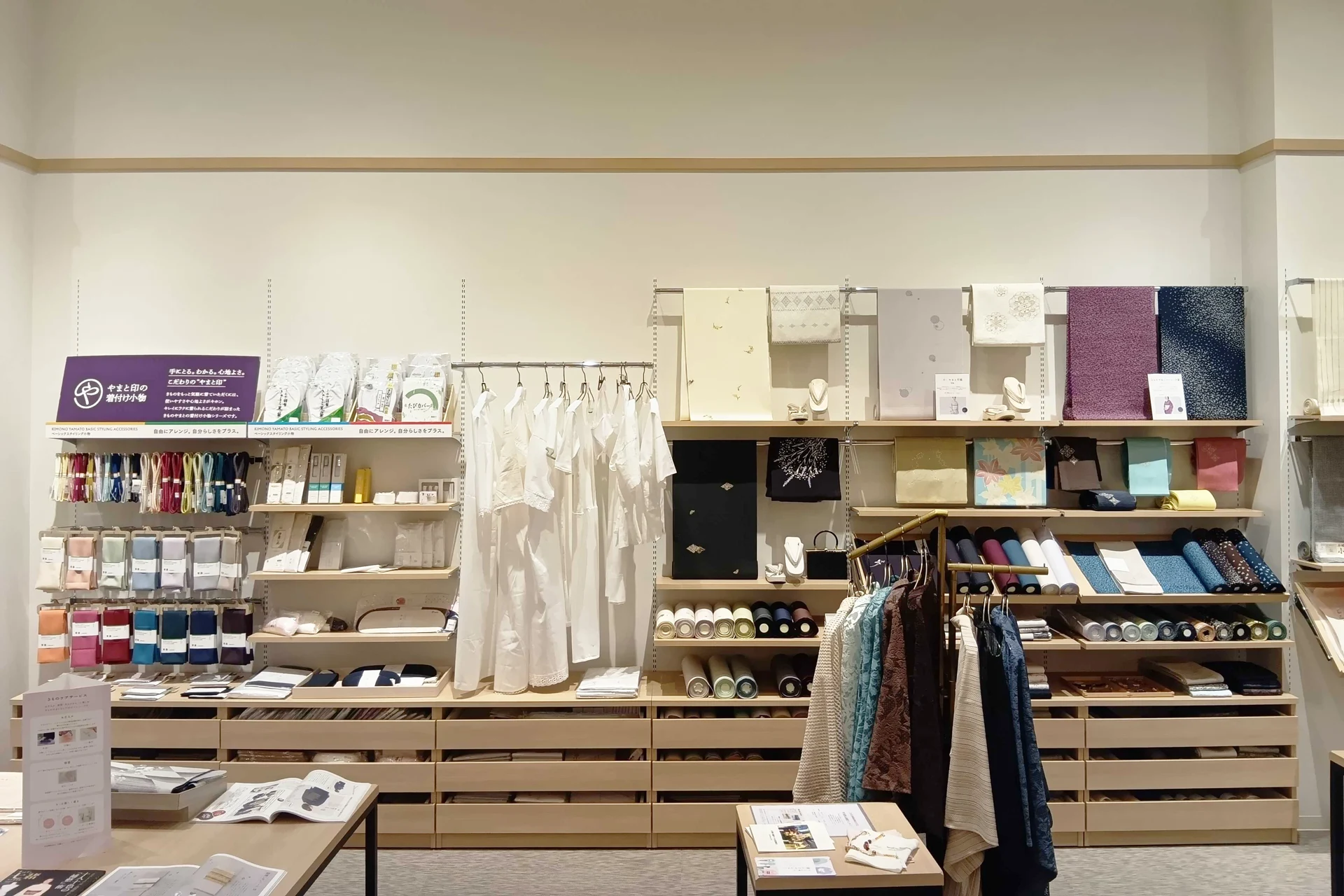 木の葉モール橋本店は、同フロア内のより多くのお客様と出会える場所へ移転し、装いを新たにリニューアルいたしました。白と木を基調に、きものの色がより映える内装となっております。