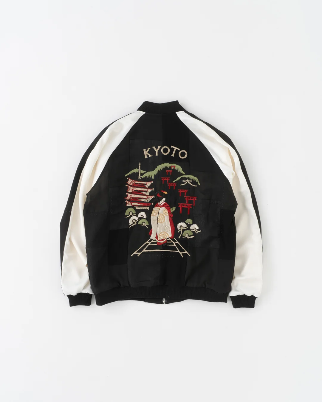 関西圏で初の開催となる本イベントでは、YAMATO Lab.の活動を紹介し、これまでに発表したアイテムの展示販売を行うとともに、開催を記念したスペシャルスカジャンを先行発売いたします。ヴィンテージキモノをパッチワークのように継ぎ接ぎしたスカジャンに「舞妓」を含む京都らしい風景を “横振り刺繍”と“金駒刺繍” で描いたジャケットは秋冬に最適なキルティング仕様となっています。