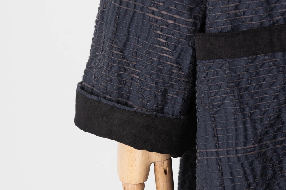 へこ帯の生地は、今期のmintdesigns新作コートに使用されている千鳥格子×刺繍レースのオリジナルテキスタイルです。起毛感のあるウールライクな千鳥格子は、メンズスーツのような感覚で、ぽってりとした刺繍レースの甘さを程よく抑えます。きもののスタイリング上、正面の前太鼓部分は帯留や帯締めなどポイントとなるアイテムが中央に配置されるため、上部のみ刺繍レースで切替えました。片側の手先は様々な結び方に対応できるよう、レース部分を広めに取ています。