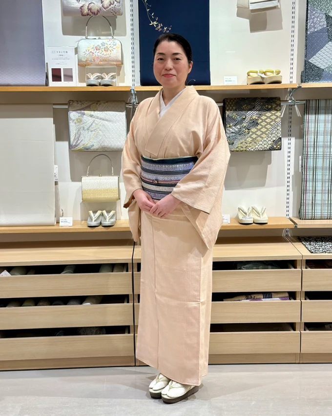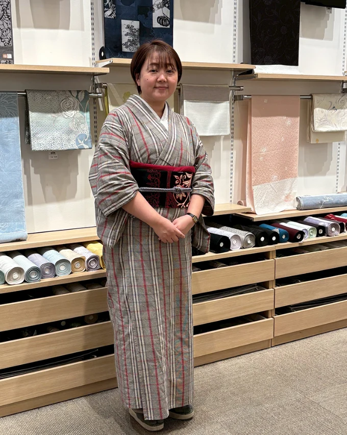 アドバイザーとして、店頭でお客様にご提案をしたり、ケアやスタイリングの相談を受けたりしています。また、出来上がり商品の検品や、LINE配信など裏方の仕事も行います。一人でも多くの方にきものがある生活をもっとエンジョイしてもらおう!という気持ちで仕事に取り組んでいます。