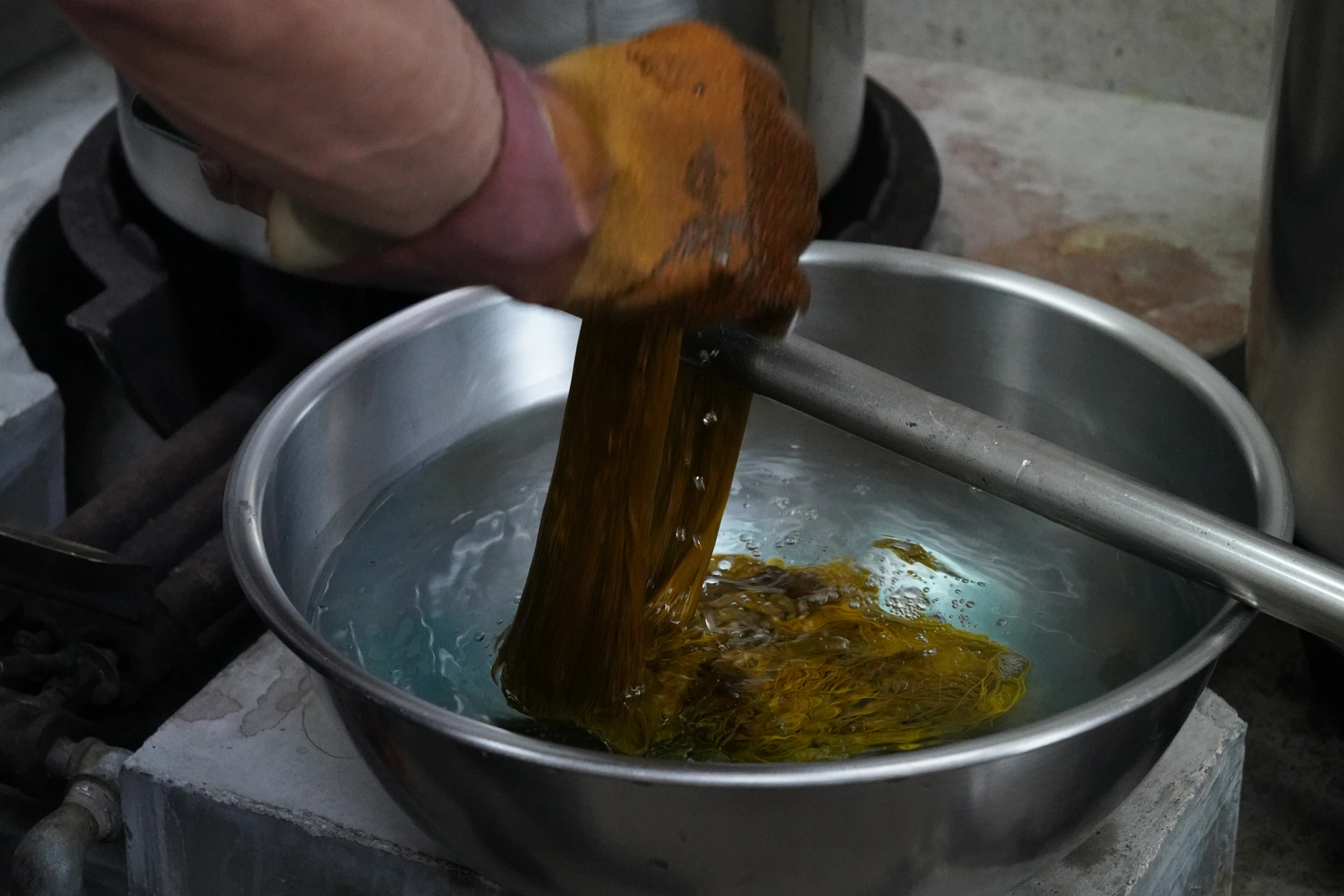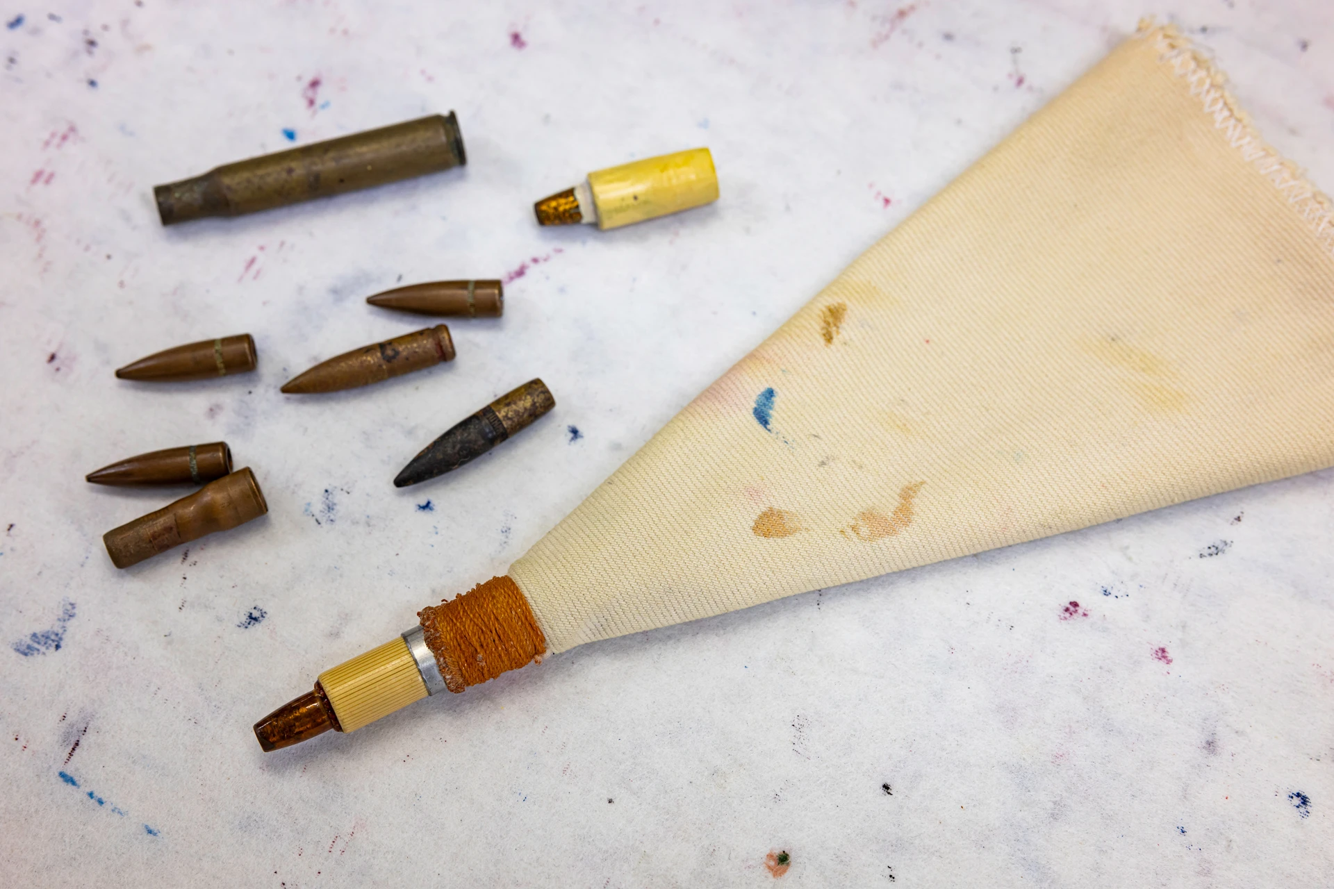 戦争で全て焼き尽くされ、物不足の中、糊伏せで使用する糊袋の筒先に用いたのが、銃弾の薬莢でした。厳しい戦闘が繰り広げられた沖縄には島のあちこちに大中小の銃弾が落ちており、それを筒先に用いたのが始まりで、城間びんがた工房では、今なお使用されています。適度な重さのある薬莢の筒先は滑りも良く糊伏せに適しているそうです。