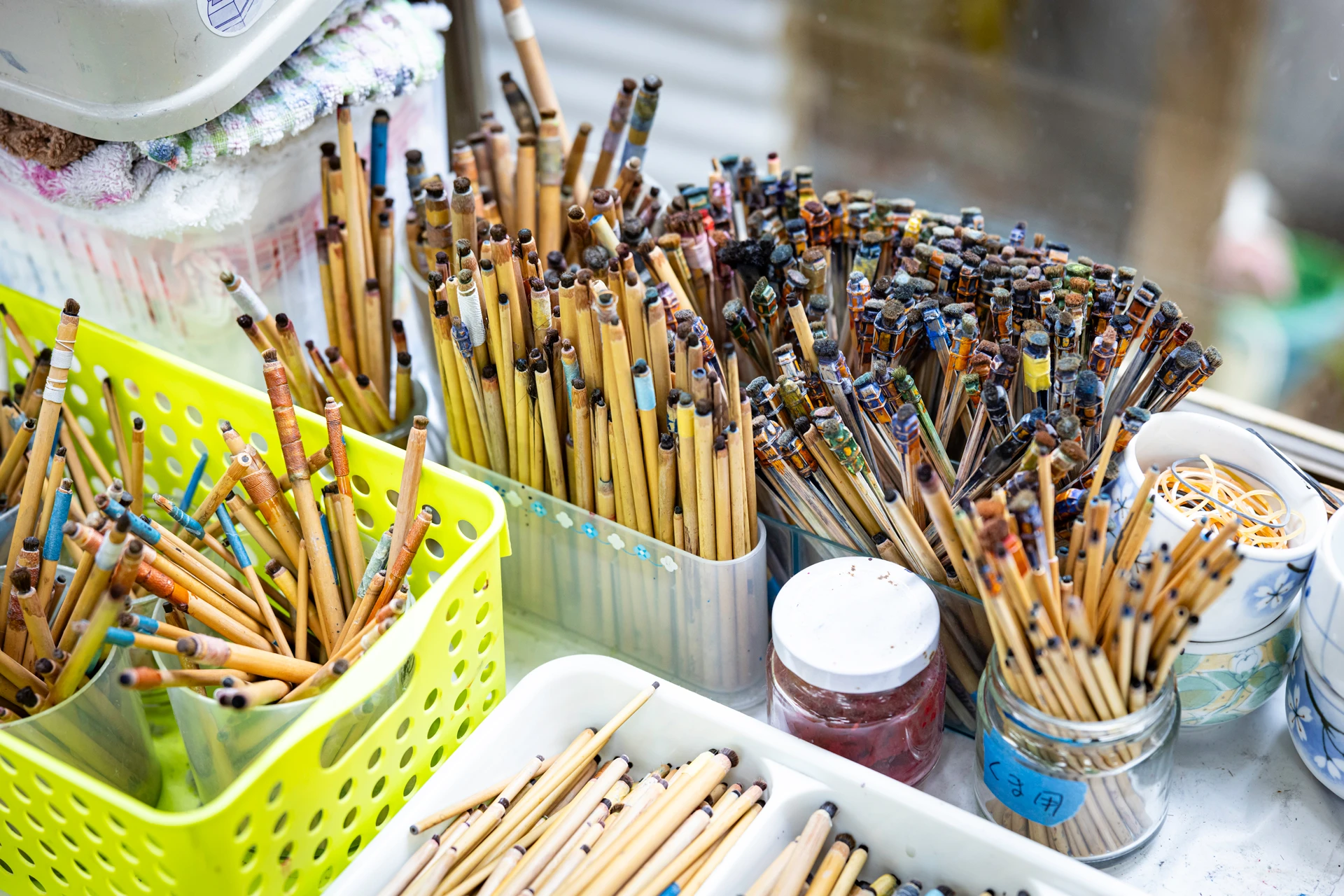 城間びんがた工房では、女性の髪を用いた手作りの筆を使っています。市販の筆より紅型の繊細な表現に適しているそうで、栄順氏が美容室から譲り受け、北部の山でとった竹を使って作っています。細かな細い線には若くて細い髪の毛、素材がざっくりとした上布や大胆な構図には年長者の太くてかたい髪の毛が良いそうです。