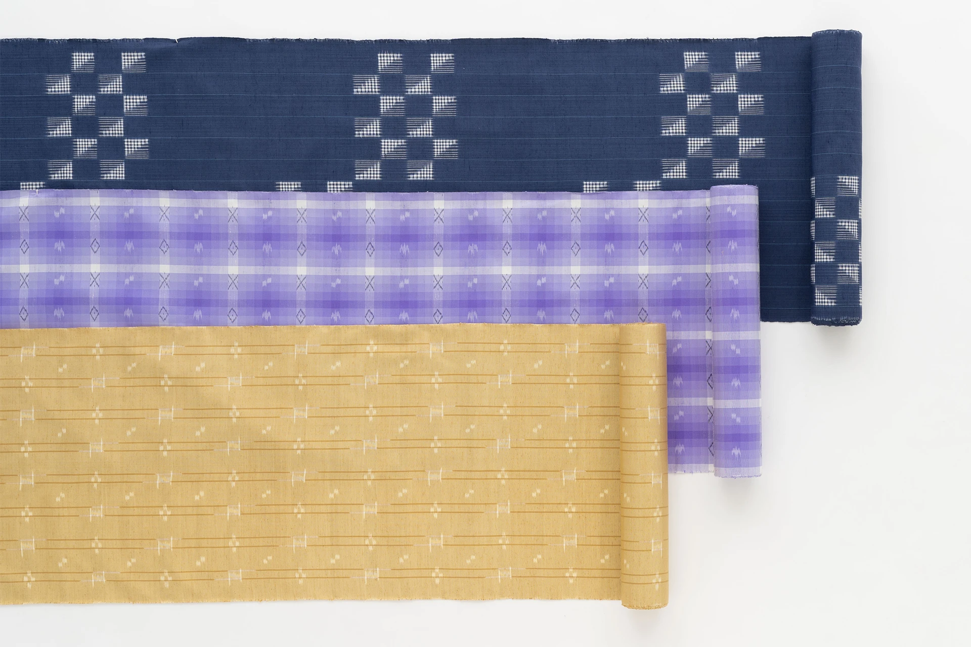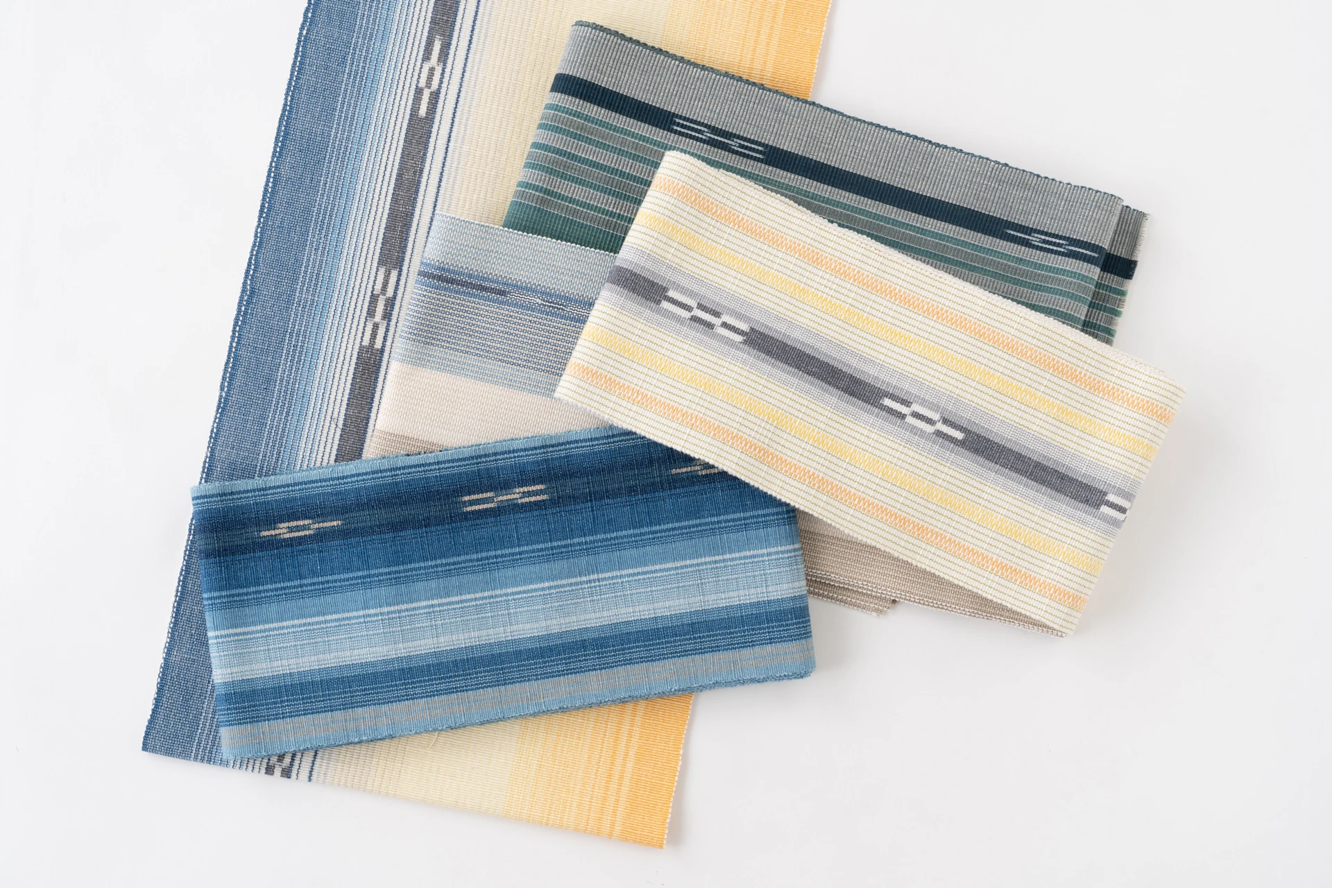ミンサー帯は、沖縄県八重山地方の石垣島、竹富島、西表島で作られている伝統織物です。ミンサーとは「綿(ミン)で織られた幅の狭(サー)い」という意味で、5 つと4 つの絣を組み合わせた「いつ(5)の世(4)」の模様が特徴で、島の娘たちが「いつの世までも末永く仲睦まじく」と想いを込めて愛しい人に贈った帯だとされています。島に自生する天然の植物から染色した糸の組み合わせにより、織工さんの感性を生かした様々なデザインの帯が生まれています。