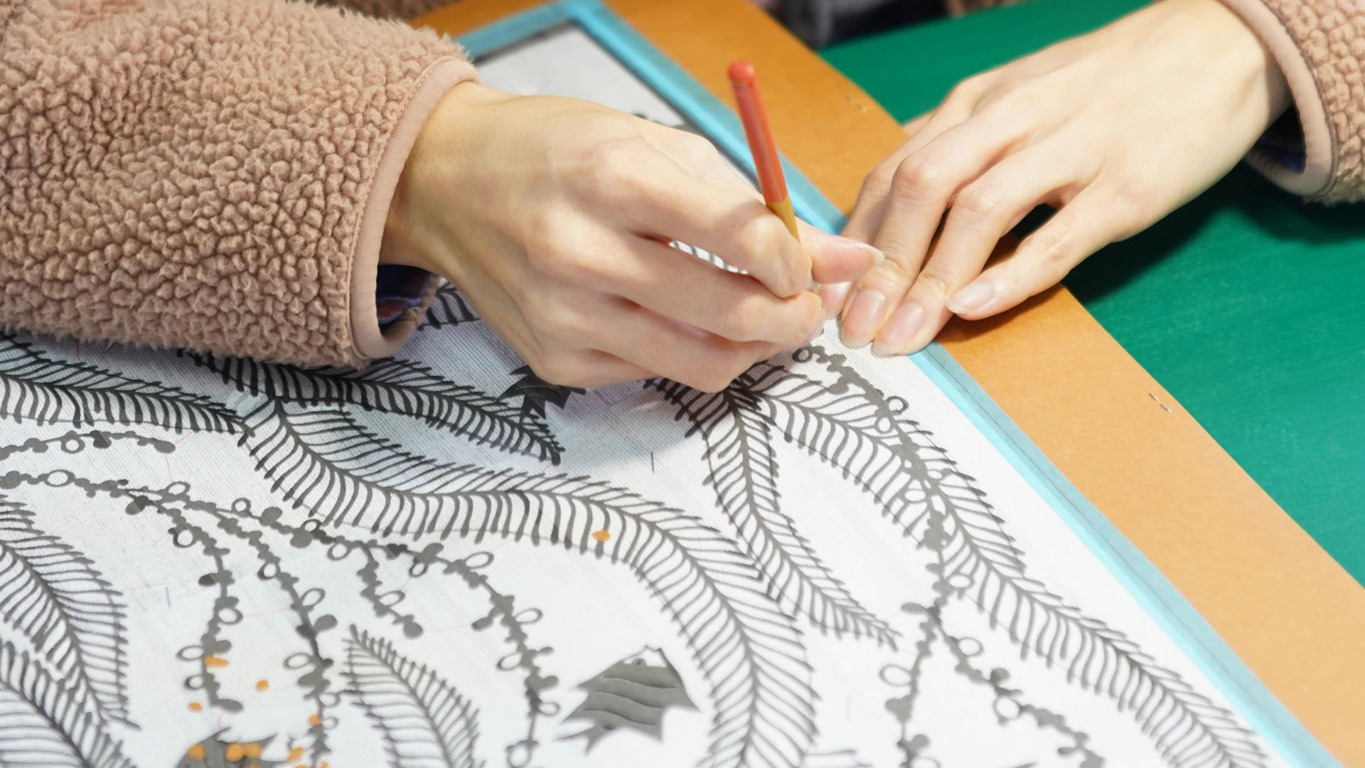 紅型の型彫りは、手前に引いて彫るのではなく、前方に向けて「突き彫り」する手法が用いられています。型紙の下にルクジュウ(豆腐を長時間陰干ししたもの)をあてがい、図案の下絵に沿って、シーグと言われる小刀で彫り進めていきます。彫り上がった型紙には薄い紗が張られます。型紙の出来栄えはその後の工程を大きく左右するため、相当に神経を使う仕事です。きれいな曲線、直線を生み出すためには熟練の経験を要します。