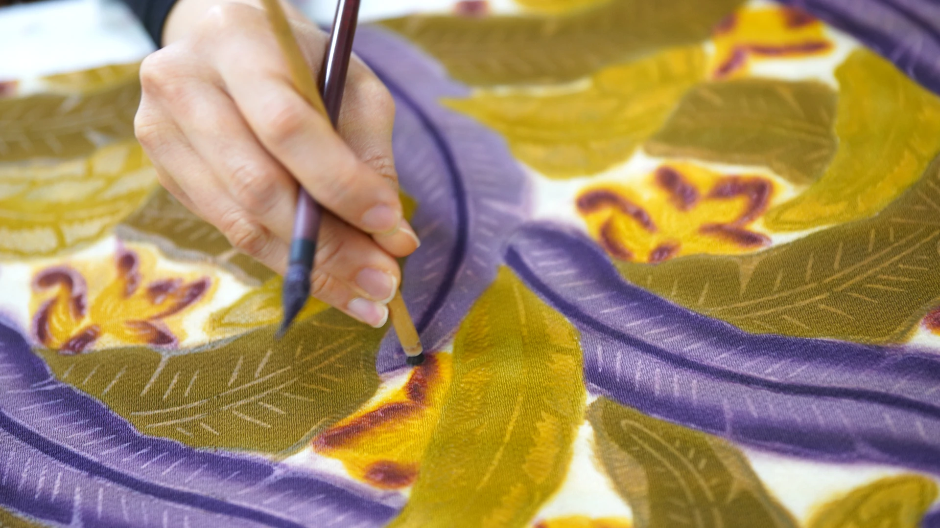 色挿し、刷り込みの後の文様の部分に「ぼかし」を施す紅型独特の技法が隈取り(クマドウイ)です。隈取りをすることにより、立体感や遠近感、透明感を出す効果が得られ、色の補強の効果もあるとされています。色挿しの際の色より若干濃いめの染料を筆につけ、ぼかしを加えたい柄の輪郭をなぞります。それを隈取り用の手作りの筆で円を描くように擦りながら、色をぼかしていきます。