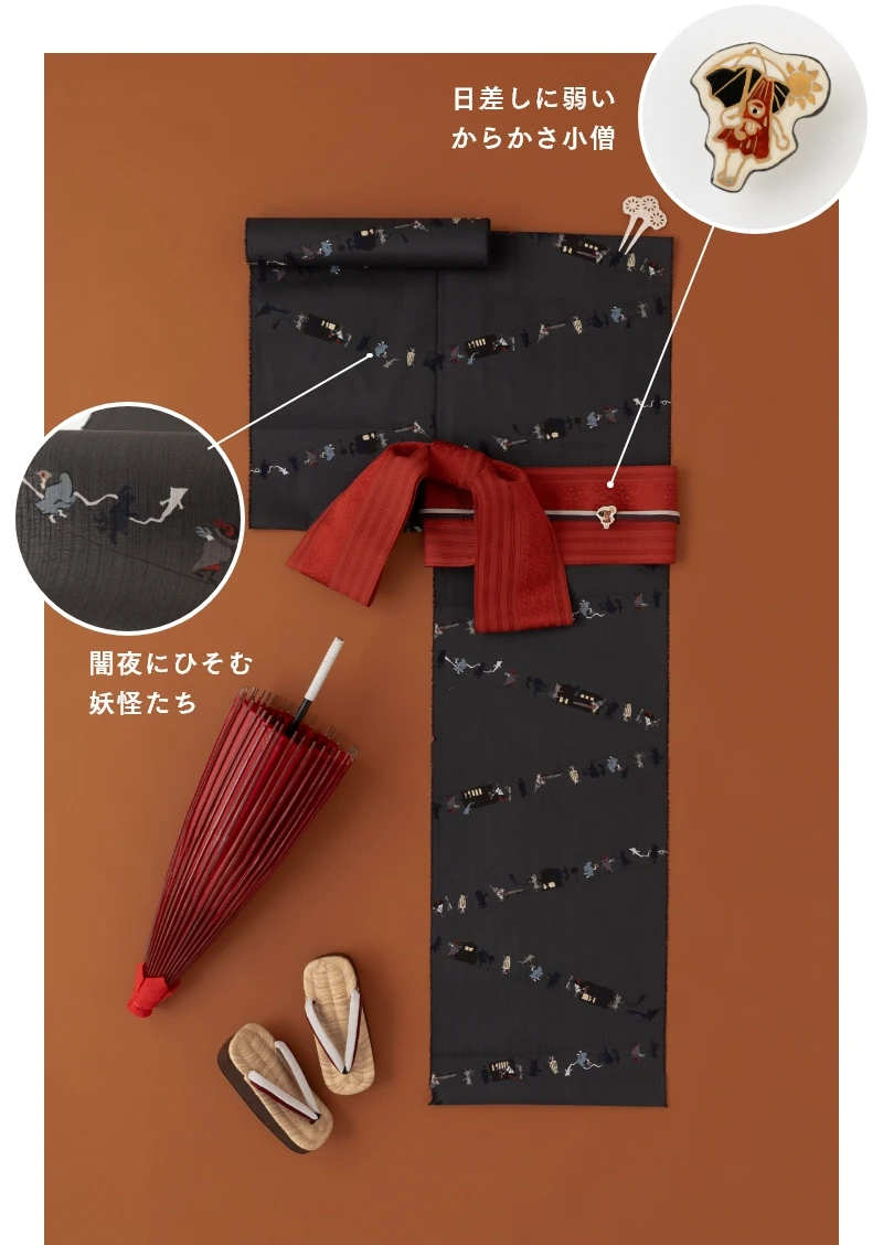 闇夜にひそむ妖怪たちが、どこかユーモラスに行き交う百鬼夜行を描いた一着。 江戸の遊び心と粋な笑いをまとえる、夏ならではのゆかたです。 邪気を払う色とされた赤の帯を差し色に添え、帯留には愛嬌たっぷりのからかさ小僧が潜んでいます。
