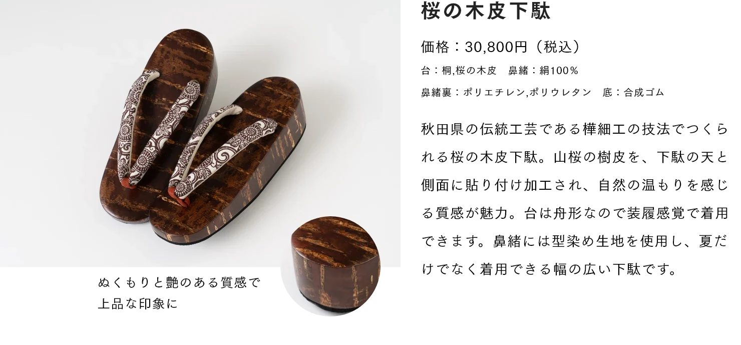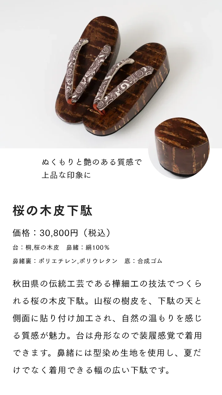 このたび発売を予定しておりました「桜の木皮下駄」につきまして、製作を担う職人の不足および原材料の調達遅延により、やむを得ず発売を延期させていただくこととなりました。