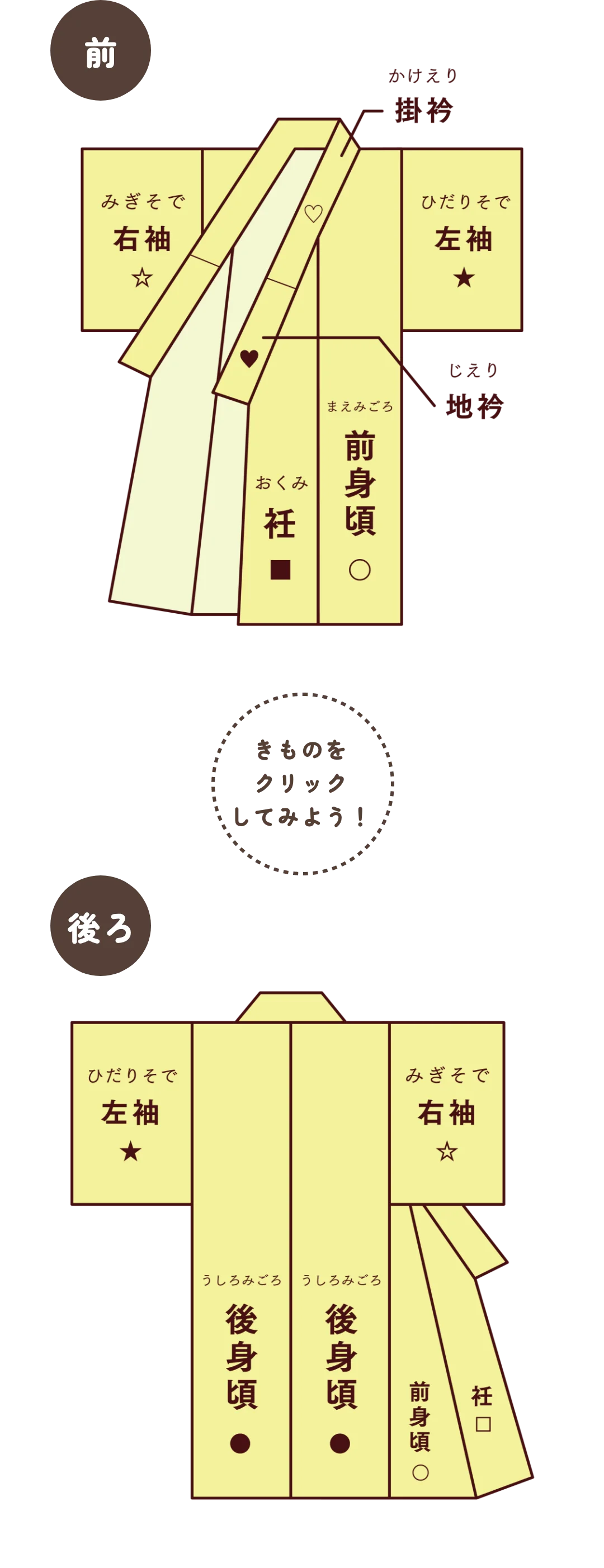 反物のそれぞれの箇所で、着物になった時にどこがどの部分になるのかはあらかじめ決まっています。なので、着物をつくる人はそこをきちんと計算しながら色柄を作っています。下の着物をクリックして、反物のどの場所が着物のどこになるのか?チェックしてみましょう!!