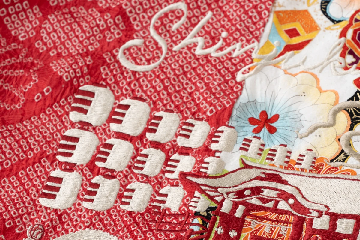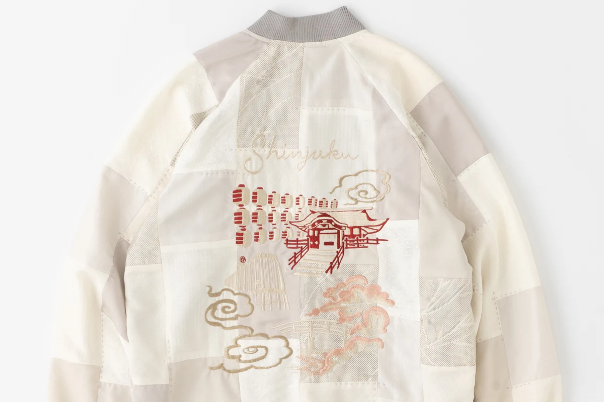 背中には「伊勢丹新宿店」を含む「神社」や「庭園」「桜」などの新宿の風景を、図案をなぞりながら職人の手で直接生地に柄を描く「横振り刺繍」で表現。テキスタイルには、大島紬や絞り染め、加賀友禅、京友禅、辻ヶ花などの技法が施されたヴィンテージキモノをセレクト。日本の職人の技術によって生み出されたスペシャルアイテムとなっています。