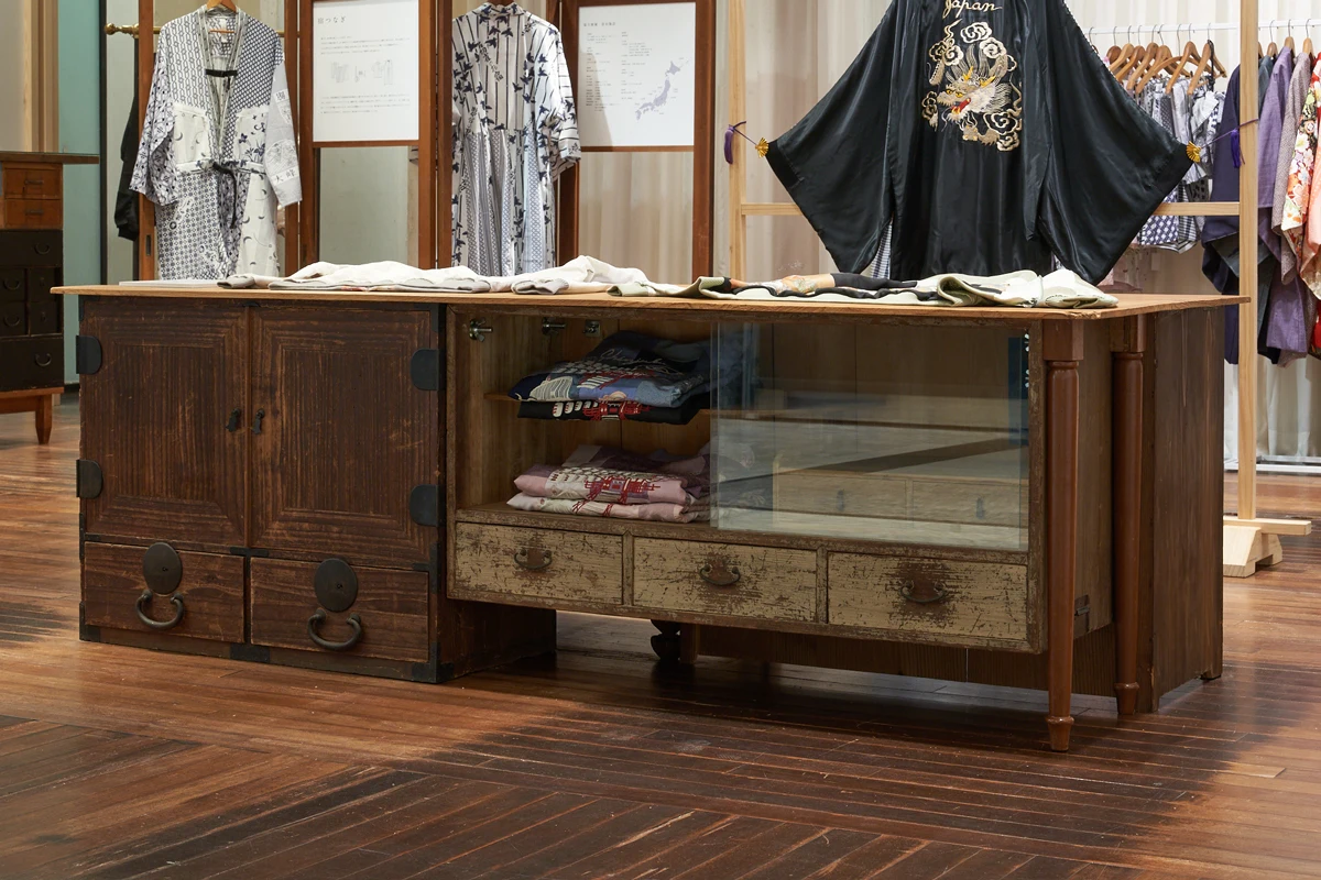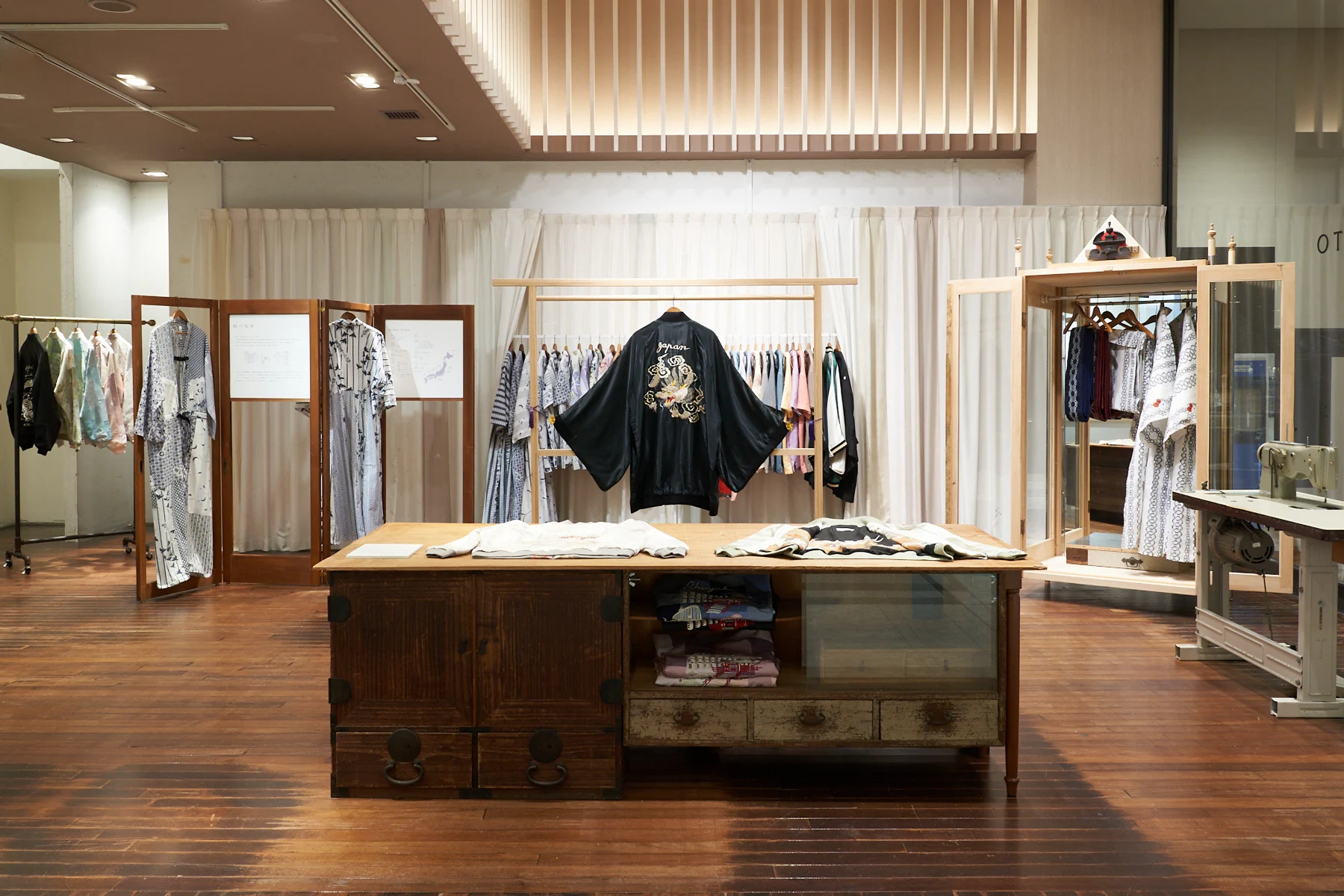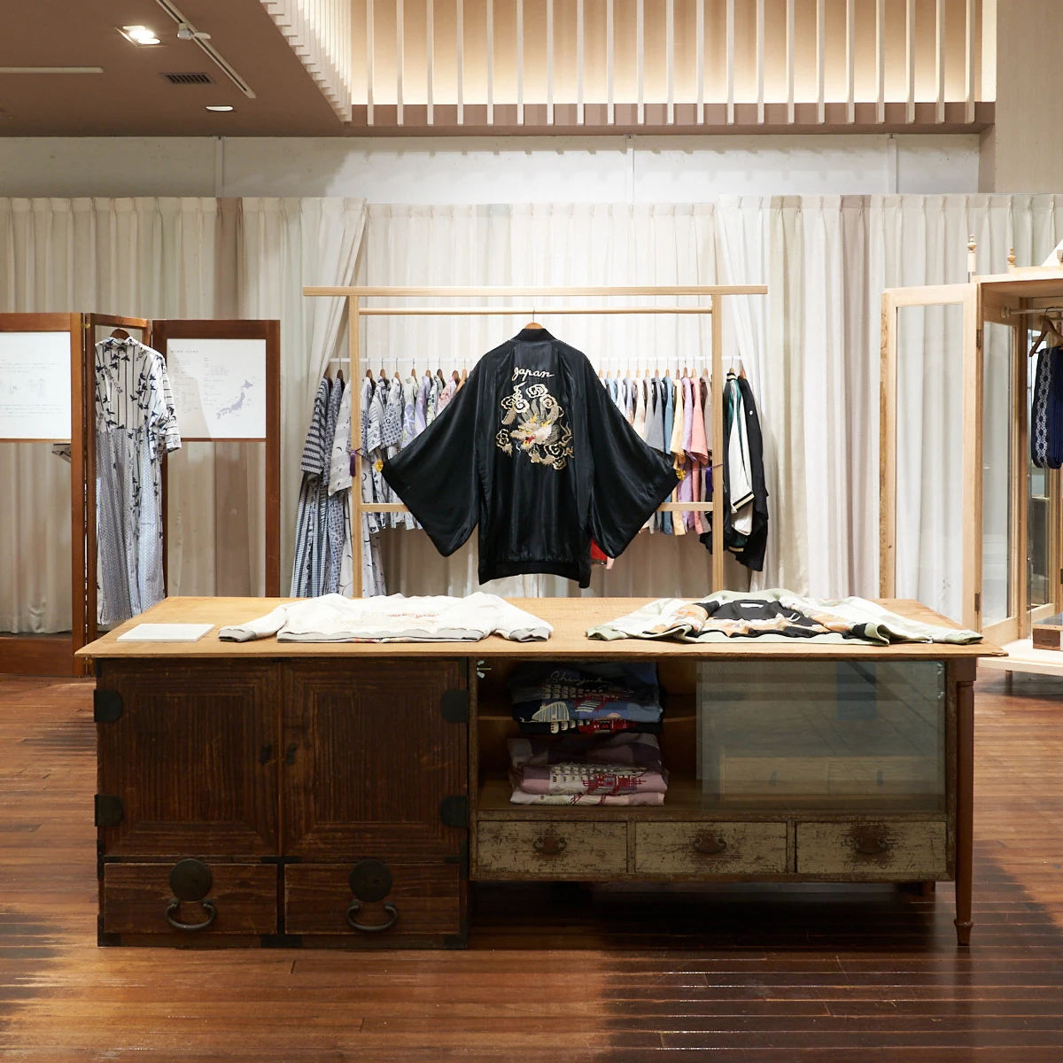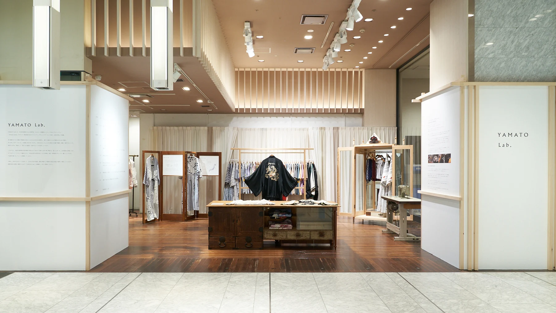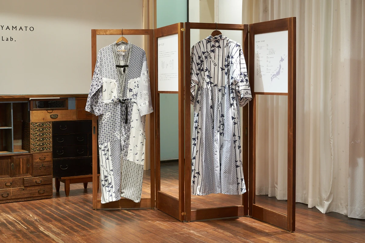 会場は、白い空間の中にパッチワークや積層されたオリジナルの箪笥や屏風、ヴィンテージキモノを抜染して制作した幕が並び、YAMATO Lab.の生み出す世界観を演出しました。