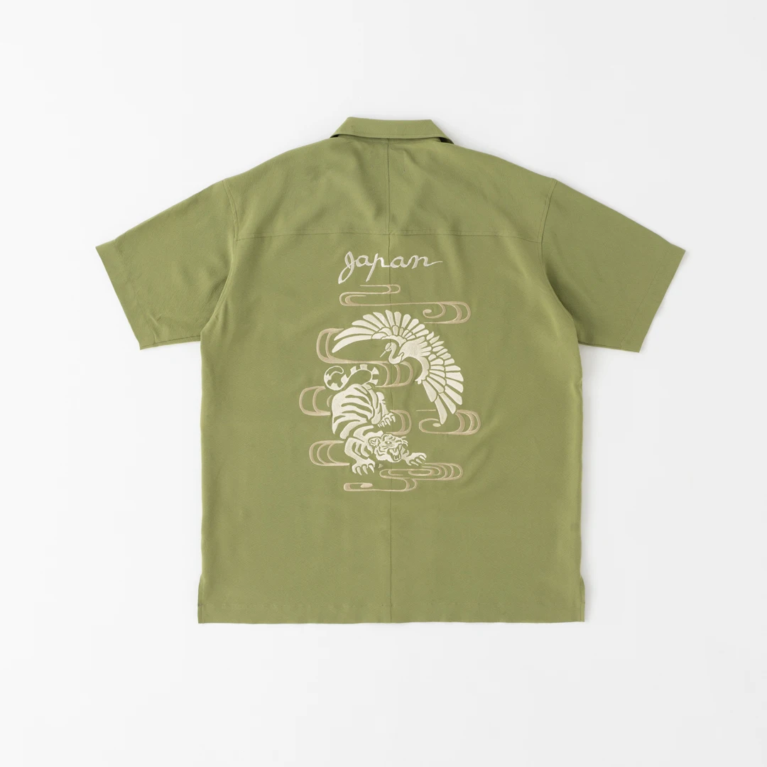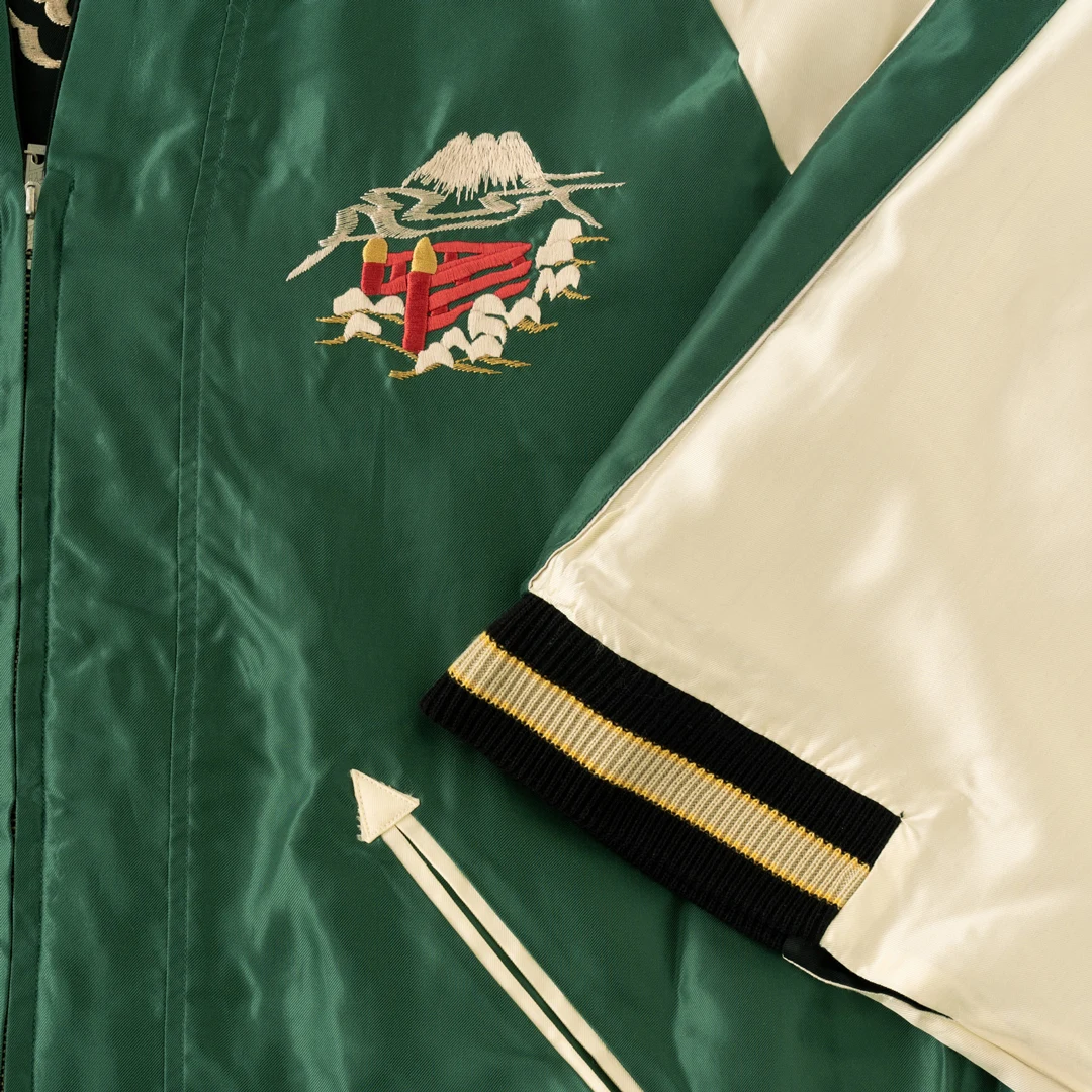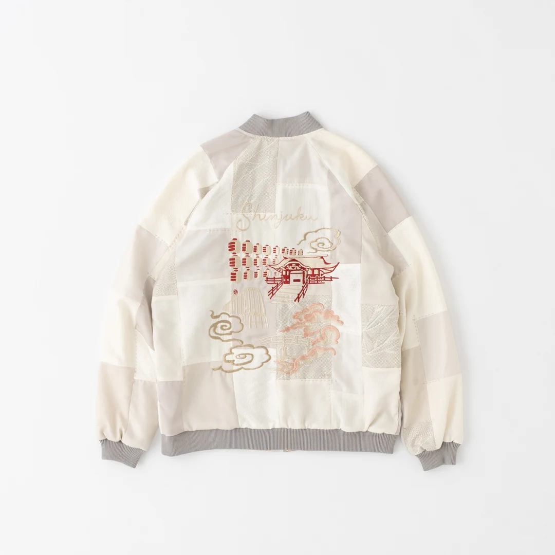 背中には、図案をなぞりながら職人の手で直接生地に柄を描く「横振り刺繍」で表現した「新宿」や「京都」のランドスケープ柄のスペシャルアイテムのほかに、日本で古くから長寿の象徴として吉祥文様に用いられる「鶴」をはじめ、飛躍や繁栄、福を集めるとされている「兎」、強靭な生命力や逞しく吠える姿から「厄払い」の意味をもつ「虎」など、それぞれのモチーフをスカジャンらしい柄に落とし込んだアイテムを展開。